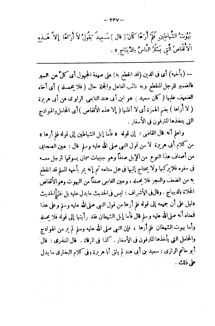 وَاعْلَمْ أَنَّهُ قَالَ الْقَاضِي : إِنَّ قَوْله " فَأَمَّا إِبِل الشَّيَاطِين إِلَى قَوْله فَلَمْ أَرَهَا " مِنْ كَلَام أَبِي هُرَيْرَة لَا مِنْ قَوْل النَّبِيّ صَلَّى اللَّه عَلَيْهِ وَسَلَّمَ قَالَ : عَيَّنَ الصَّحَابِيّ مِنْ أَصْنَاف هَذَا النَّوْع مِنْ الْإِبِل صِنْفًا وَهُوَ جَنِيبَات سِمَان يَسُوقهَا الرَّجُل مَعَهُ فِي سَفَره فَلَا يَرْكَبهَا وَلَا يَحْتَاج إِلَيْهَا فِي حَمْل مَتَاعه ثُمَّ إِنَّهُ يَمُرّ بِأَخِيهِ الْمُسْلِم قَدْ اُنْقُطِعَ بِهِ مِنْ الضَّعْف وَالْعَجْز فَلَا يَحْمِلهُ ، وَعَيَّنَ التَّابِعِيّ صِنْفًا مِنْ الْبُيُوت وَهُوَ الْأَقْفَاص الْمُحَلَّاة بِالدِّيبَاجِ . وَقَالَ فِي الْأَشْرَاف : لَيْسَ فِي الْحَدِيث مَا يَدُلّ عَلَيْهِ بَلْ نَظْم الْحَدِيث دَلِيل عَلَى أَنَّ جَمِيعه إِلَى قَوْله : فَلَمْ أَرَهَا مِنْ قَوْل النَّبِيّ صَلَّى اللَّه عَلَيْهِ وَسَلَّمَ وَعَلَى هَذَا فَمَعْنَاهُ أَنَّهُ صَلَّى اللَّه عَلَيْهِ وَسَلَّمَ قَالَ : فَأَمَّا إِبِل الشَّيْطَان فَقَدْ رَأَيْتهَا إِلَى قَوْله فَلَا يَحْمِلهُ وَأَمَّا بُيُوت الشَّيْطَان فَلَمْ أَرَهَا ، فَإِنَّ النَّبِيّ صَلَّى اللَّه عَلَيْهِ وَسَلَّمَ لَمْ يَرَ مِنْ الْهَوَادِج وَالْمَحَامِل الَّتِي يَأْخُذهَا الْمُتْرَفُونَ فِي الْأَسْفَار . كَذَا فِي الْمِرْقَاة .