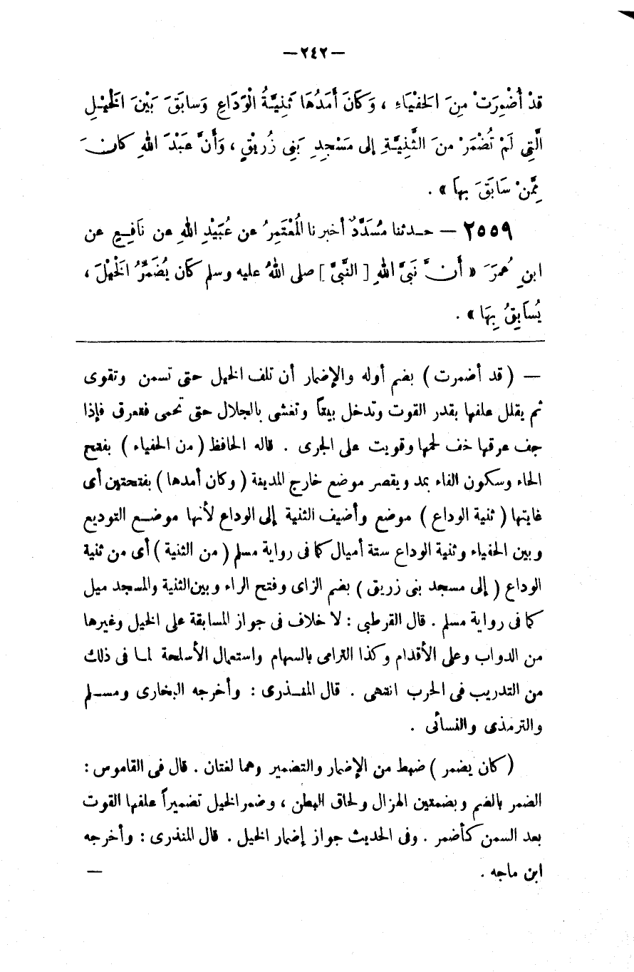 : ضُبِطَ مِنْ الْإِضْمَار وَالتَّضْمِير وَهُمَا لُغَتَانِ . قَالَ فِي الْقَامُوس : الضُّمْر بِالضَّمِّ وَبِضَمَّتَيْنِ الْهُزَال وَلَحَاق الْبَطْن ، وَضَمَّرَ الْخَيْل تَضْمِيرًا عَلَفَهَا الْقُوت بَعْد السِّمَن كَأَضْمَرَ . وَفِي الْحَدِيث جَوَاز إِضْمَار الْخَيْل .