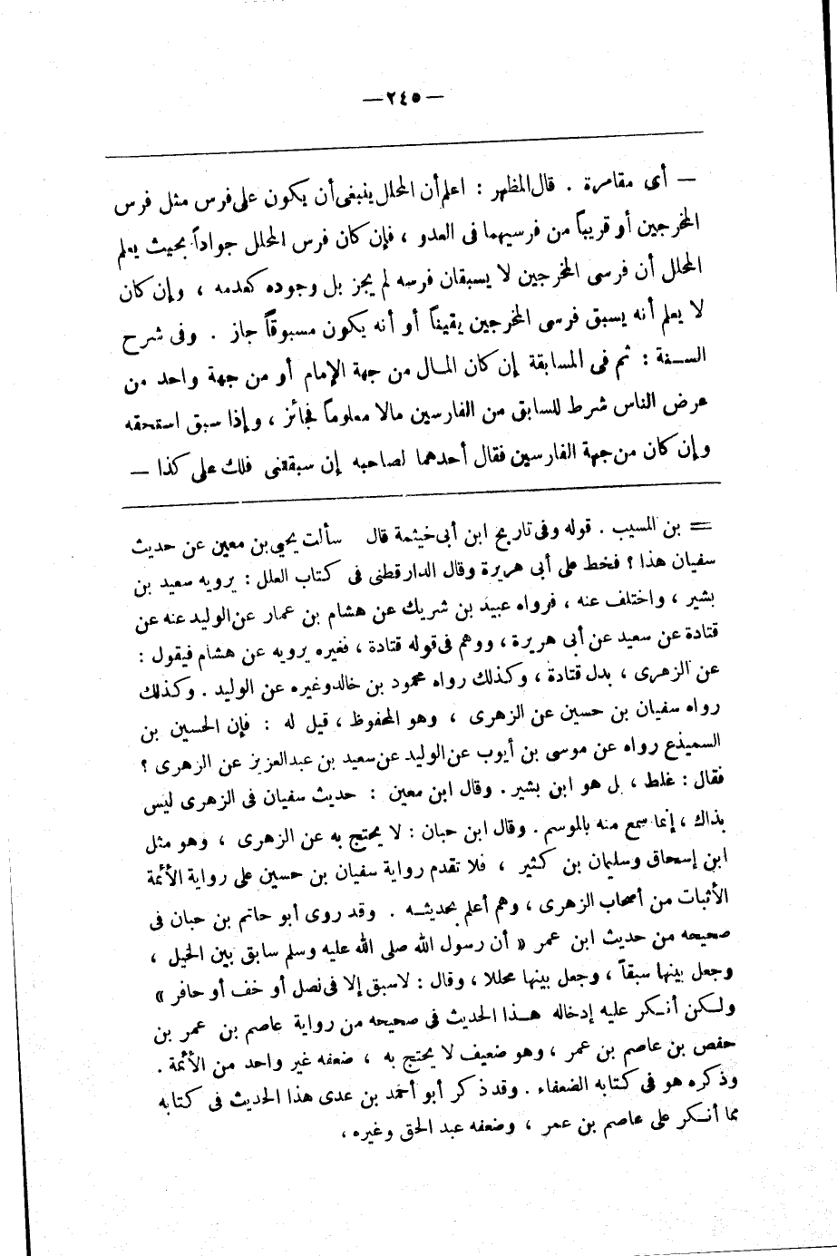 وقد روى أبو حاتم بن حبان في صحيحه من حديث ابن عمر أن رسول الله صلى الله عليه و سلم سابق بين الخيل وجعل بينها سبقا وجعل بينها محللا وقال لا سبق إلا في نصل أو خف أو حافر ولكن أنكر عليه إدخاله هذا الحديث في صحيحه من رواية عاصم بن عمر بن حفص بن عاصم بن عمر وهو ضعيف لا يحتج به ضعفه غير واحد من الأئمة