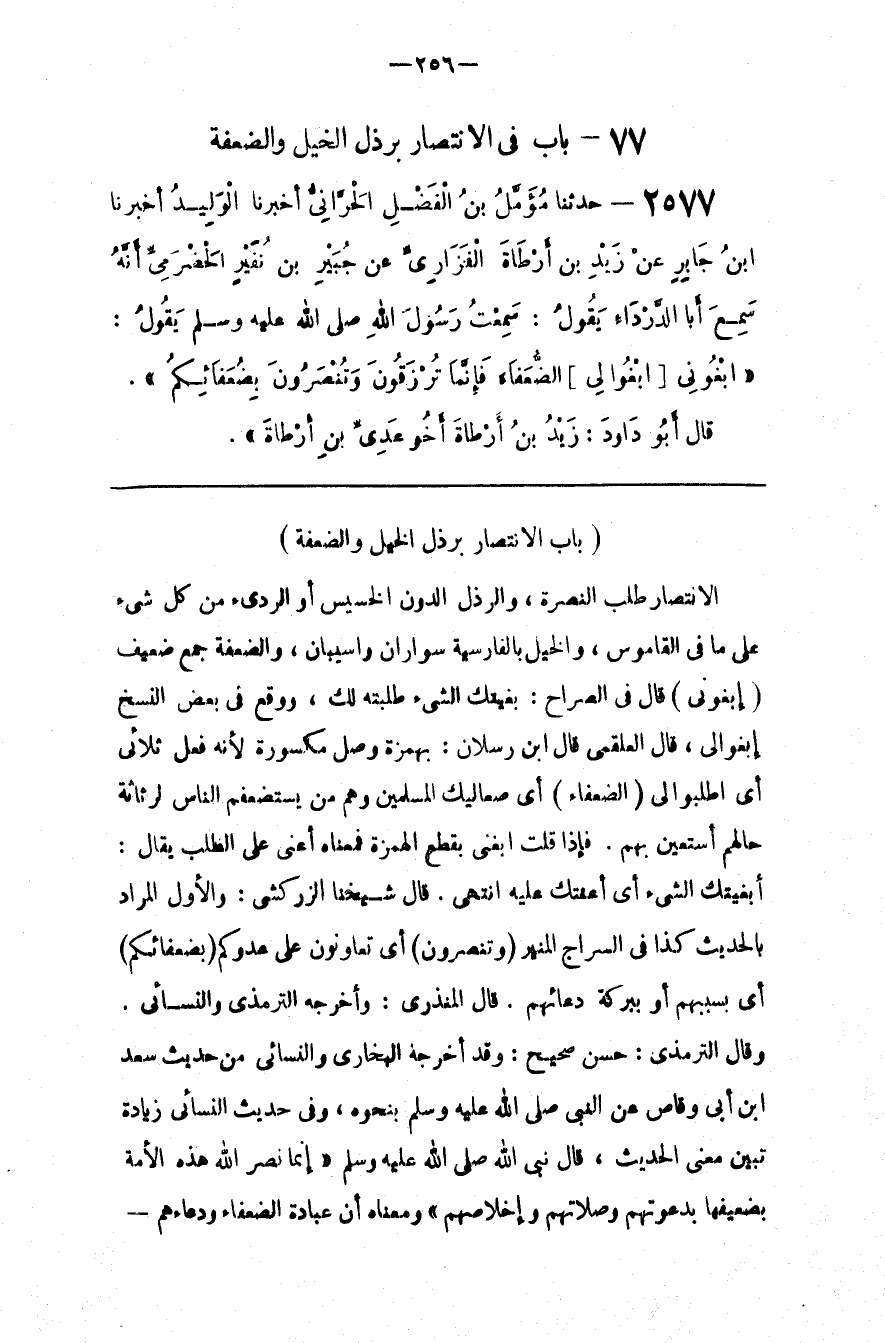 قَالَ الْمُنْذِرِيُّ : وَأَخْرَجَهُ التِّرْمِذِيّ وَالنَّسَائِيُّ . وَقَالَ التِّرْمِذِيّ : حَسَن صَحِيح : وَقَدْ أَخْرَجَهُ الْبُخَارِيّ وَالنَّسَائِيُّ مِنْ حَدِيث سَعْد بْن أَبِي وَقَّاص عَنْ النَّبِيّ صَلَّى اللَّه عَلَيْهِ وَسَلَّمَ بِنَحْوِهِ ، وَفِي حَدِيث النَّسَائِيِّ زِيَادَة تُبَيِّن مَعْنَى الْحَدِيث ، قَالَ نَبِيّ اللَّه : " إِنَّمَا نَصَرَ اللَّه هَذِهِ الْأُمَّة بِضَعِيفِهَا بِدَعْوَتِهِمْ وَصَلَاتهمْ وَإِخْلَاصهمْ " وَمَعْنَاهُ أَنَّ عِبَادَة الضُّعَفَاء وَدُعَاءَهُمْ@