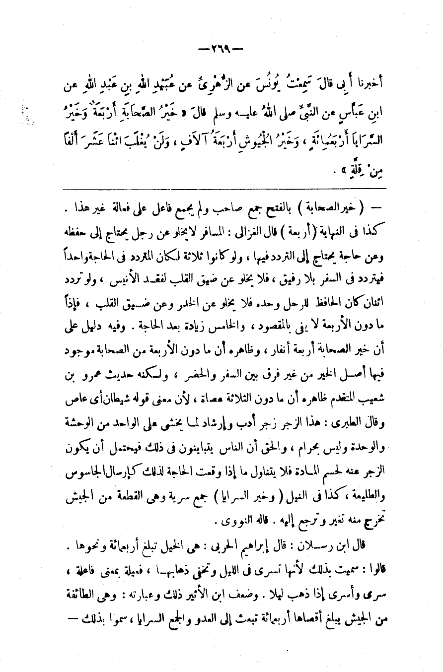 : قَالَ الْغَزَالِيّ : الْمُسَافِر لَا يَخْلُو عَنْ رَجُل يَحْتَاج إِلَى حِفْظه وَعَنْ حَاجَة يَحْتَاج إِلَى التَّرَدُّد فِيهَا ، وَلَوْ كَانُوا ثَلَاثَة لَكَانَ الْمُتَرَدِّد فِي الْحَاجَة وَاحِدًا فَيَتَرَدَّد فِي السَّفَر بِلَا رَفِيق ، فَلَا فَيَخْلُو عَنْ ضِيق الْقَلْب لِفَقْدِ الْأَنِيس ، وَلَوْ تَرَدَّدَ اِثْنَانِ كَانَ الْحَافِظ لِلرَّحْلِ وَحْده فَلَا يَخْلُو عَنْ الْخِدْر وَعَنْ ضِيق الْقَلْب ، فَإِذًا مَا دُون الْأَرْبَعَة لَا يَفِي بِالْمَقْصُودِ ، وَالْخَامِس زِيَادَة بَعْد الْحَاجَة . وَفِيهِ دَلِيل عَلَى أَنَّ خَيْر الصَّحَابَة أَرْبَعَة أَنْفَار ، وَظَاهِره أَنَّ مَا دُون الْأَرْبَعَة مِنْ الصَّحَابَة مَوْجُود فِيهَا أَصْل الْخَيْر مِنْ غَيْر فَرْق بَيْن السَّفَر وَالْحَضَر ، وَلَكِنَّهُ حَدِيث عَمْرو بْن شُعَيْب الْمُتَقَدِّم ظَاهِره أَنَّ مَا دُون الثَّلَاثَة عُصَاة ، لِأَنَّ مَعْنَى قَوْله شَيْطَان أَيْ عَاصٍ وَقَالَ الطَّبَرِيُّ : هَذَا الزَّجْر زَجْر أَدَب وَإِرْشَاد لِمَا يُخْشَى عَلَى الْوَاحِد مِنْ الْوَحْشَة وَالْوَحْدَة وَلَيْسَ بِحَرَامٍ ، وَالْحَقّ أَنَّ النَّاس يَتَبَايَنُونَ فِي ذَلِكَ ، فَيَحْتَمِل أَنْ يَكُون الزَّجْر عَنْهُ لِحَسْمِ الْمَادَّة فَلَا يَتَنَاوَل مَا إِذَا وَقَعَتْ الْحَاجَة لِذَلِكَ كَإِرْسَالِ الْجَاسُوس وَالطَّلِيعَة ، كَذَا فِي النَّيْل