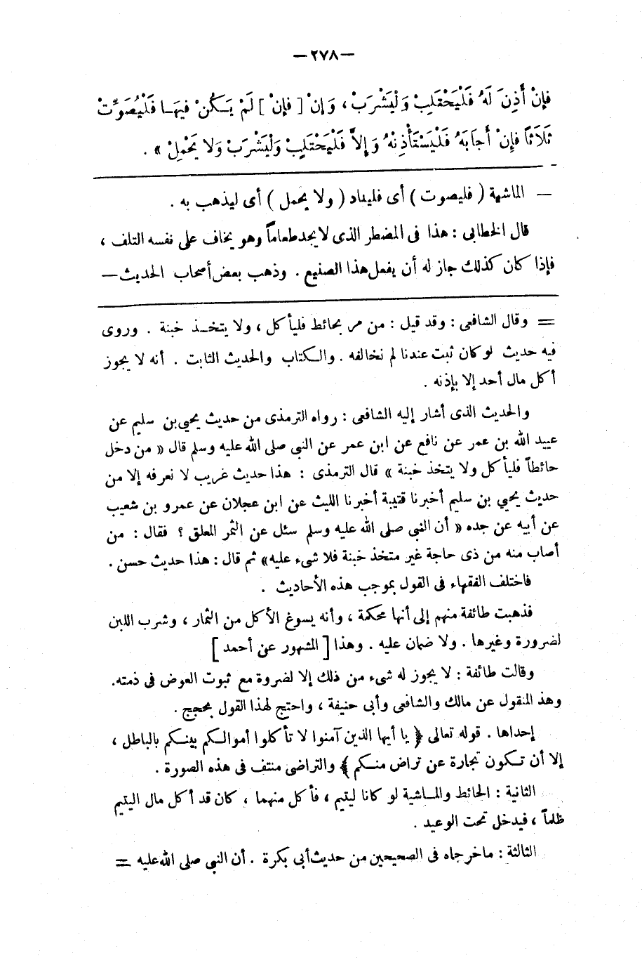 فذهبت طائفة منهم إلى أنها محكمة وأنه يسوغ الأكل من الثمار وشرب اللبن لضرورة وغيرها