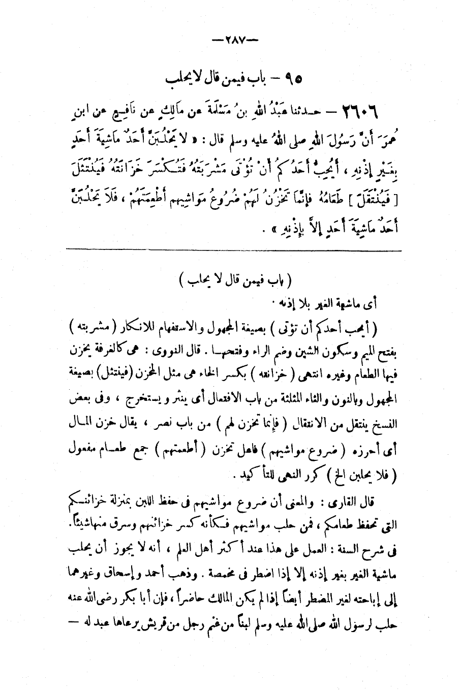 قَالَ الْقَارِيّ : وَالْمَعْنَى أَنَّ ضُرُوع مَوَاشِيهمْ فِي حِفْظ اللَّبَن بِمَنْزِلَةِ خَزَائِنكُمْ الَّتِي تَحْفَظ طَعَامكُمْ ، فَمَنْ حَلَبَ مَوَاشِيهمْ فَكَأَنَّهُ كَسَرَ خَزَائِنهمْ وَسَرَقَ مِنْهَا شَيْئًا . فِي شَرْح السُّنَّة : الْعَمَل عَلَى هَذَا عِنْد أَكْثَر أَهْل الْعِلْم ، أَنَّهُ لَا يَجُوز أَنْ يَحْلُب مَاشِيَة الْغَيْر بِغَيْرِ إِذْنه إِلَّا إِذَا اُضْطُرَّ فِي مَخْمَصَة . وَذَهَبَ أَحْمَد وَإِسْحَاق وَغَيْرهمَا إِلَى إِبَاحَته لِغَيْرِ الْمُضْطَرّ أَيْضًا إِذَا لَمْ يَكُنْ الْمَالِك حَاضِرًا ، فَإِنَّ أَبَا بَكْر رَضِيَ اللَّه عَنْهُ حَلَبَ لِرَسُولِ اللَّه صَلَّى اللَّه عَلَيْهِ وَسَلَّمَ لَبَنًا مِنْ غَنَم رَجُل مِنْ قُرَيْش يَرْعَاهَا عَبْد لَهُ@