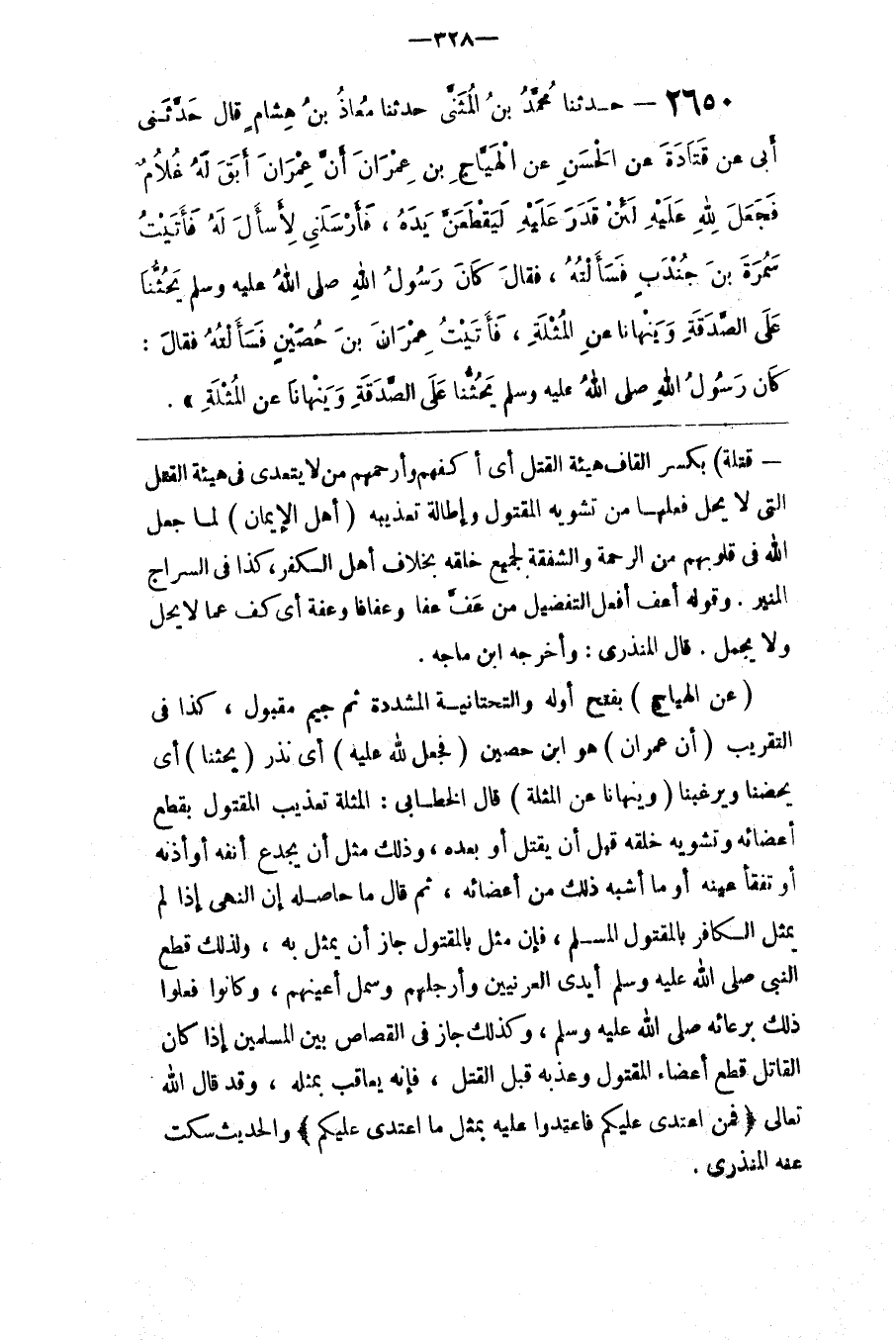 : قَالَ الْخَطَّابِيُّ : الْمُثْلَة تَعْذِيب الْمَقْتُول بِقَطْعِ أَعْضَائِهِ وَتَشْوِيه خَلْقه قَبْل أَنْ يُقْتَل أَوْ بَعْده ، وَذَلِكَ مِثْل أَنْ يُجْدَع أَنْفه أَوْ أُذُنه أَوْ تُفْقَأ عَيْنه أَوْ مَا أَشْبَهَ ذَلِكَ مِنْ أَعْضَائِهِ ، ثُمَّ قَالَ مَا حَاصِله إِنَّ النَّهْي إِذَا لَمْ يُمَثِّل الْكَافِر بِالْمَقْتُولِ الْمُسْلِم ، فَإِنْ مَثَّلَ بِالْمَقْتُولِ جَازَ أَنْ يُمَثَّل بِهِ ، وَلِذَلِكَ قَطَعَ النَّبِيّ صَلَّى اللَّه عَلَيْهِ وَسَلَّمَ أَيْدِي الْعُرَنِيِّينَ وَأَرْجُلهمْ وَسَمَلَ أَعْيُنهمْ ، وَكَانُوا فَعَلُوا ذَلِكَ بِرِعَائِهِ صَلَّى اللَّه عَلَيْهِ وَسَلَّمَ ، وَكَذَلِكَ جَازَ فِي الْقِصَاص بَيْن الْمُسْلِمِينَ إِذَا كَانَ الْقَاتِل قَطَعَ أَعْضَاء الْمَقْتُول وَعَذَّبَهُ قَبْل الْقَتْل ، فَإِنَّهُ يُعَاقَب بِمِثْلِهِ ، وَقَدْ قَالَ اللَّه تَعَالَى { فَمَنْ اِعْتَدَى عَلَيْكُمْ فَاعْتَدُوا عَلَيْهِ بِمِثْلِ مَا اِعْتَدَى عَلَيْكُمْ } وَالْحَدِيث سَكَتَ عَنْهُ الْمُنْذِرِيُّ .@