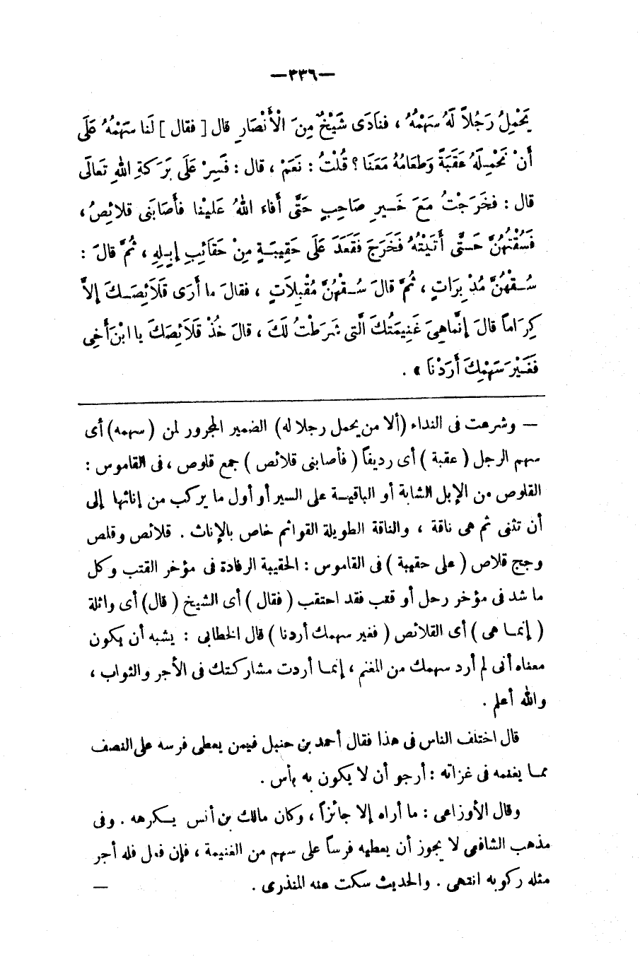 قَالَ اِخْتَلَفَ النَّاس فِي هَذَا فَقَالَ أَحْمَد بْن حَنْبَل فِيمَنْ يُعْطِي فَرَسه عَلَى النِّصْف مِمَّا يَغْنَمهُ فِي غُزَاته : أَرْجُو أَنْ لَا يَكُون بِهِ بَأْس .