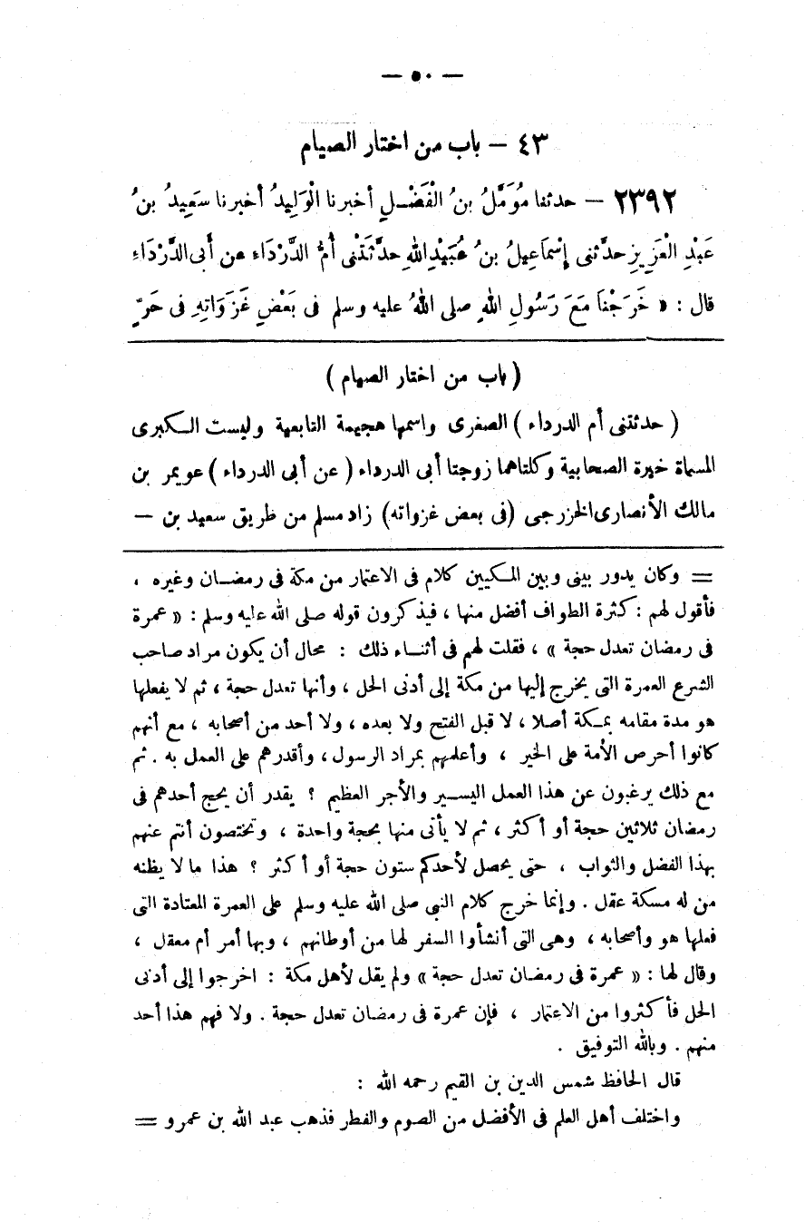 فأقول لهم كثرة الطواف أفضل منهافيذكرون قوله صلى الله عليه و سلم عمرة في رمضان تعدل حجة فقلت لهم في أثناء ذلك محال أن يكون مراد صاحب الشرع العمرة التي يخرج إليها من مكة إلى أدنى الحل وأنها تعدل حجة ثم لا يفعلها هو مدة مقامه بمكة أصلا لا قبل الفتح ولا بعده ولا أحد من أصحابه مع أنهم كانوا أحرص الأمة على الخير وأعلمهم بمراد الرسول وأقدرهم على العمل به
