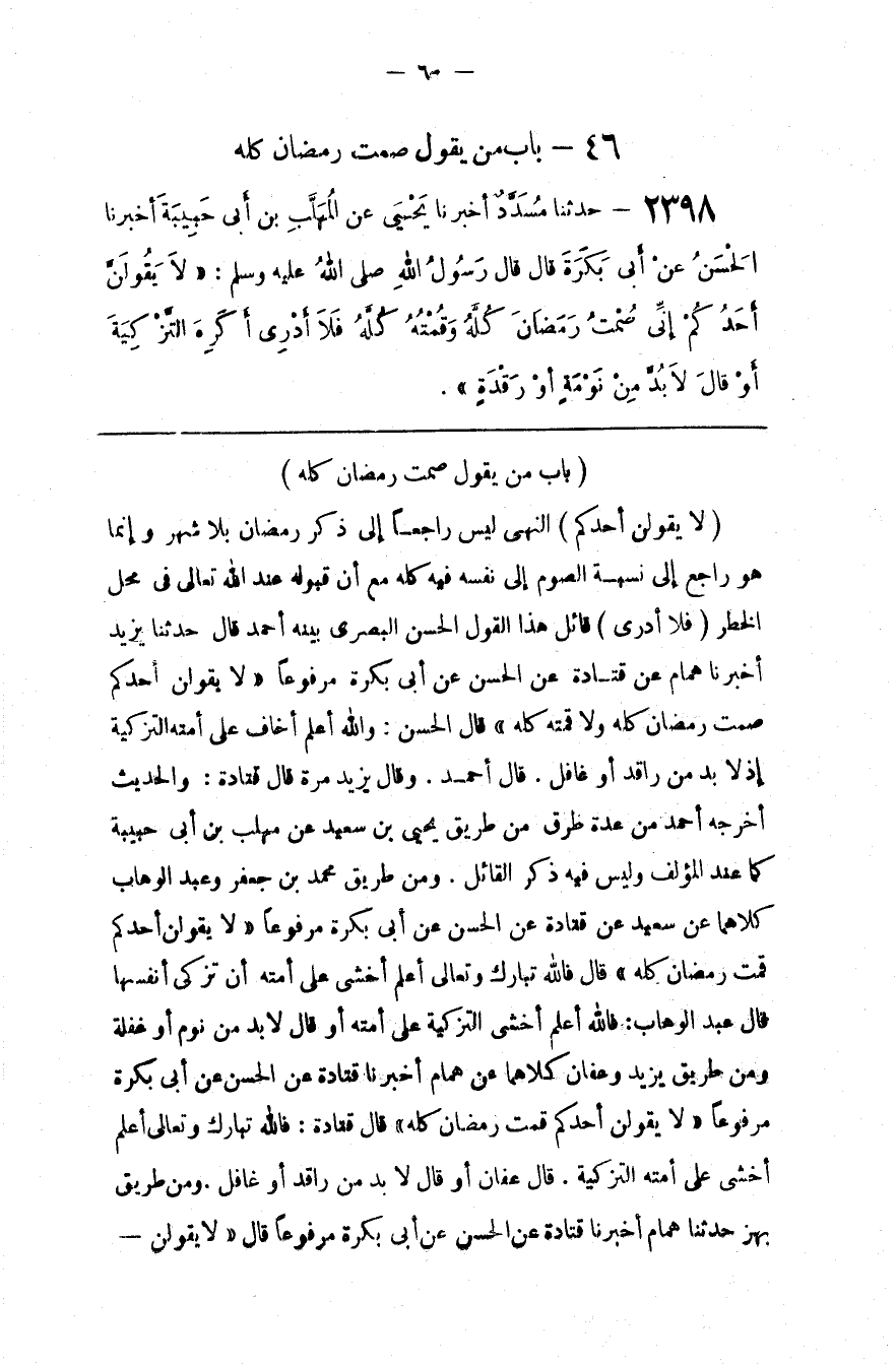 : قَائِل هَذَا الْقَوْل الْحَسَن الْبَصْرِيّ بَيَّنَهُ أَحْمَد قَالَ حَدَّثَنَا يَزِيد أَخْبَرَنَا هَمَّام عَنْ قَتَادَةَ عَنْ الْحَسَن عَنْ أَبِي بَكْرَة مَرْفُوعًا " لَا يَقُولَنَّ أَحَدكُمْ صُمْت رَمَضَان كُلّه وَلَا قُمْته كُلّه " قَالَ الْحَسَن : وَاَللَّه أَعْلَم أَخَافَ عَلَى أُمَّته التَّزْكِيَة إِذْ لَا بُدّ مِنْ رَاقِد أَوْ غَافِل . وَقَالَ أَحْمَد : وَقَالَ يَزِيد مُرَّة قَالَ قَتَادَةُ : وَالْحَدِيث أَخْرَجَهُ أَحْمَد مِنْ عِدَّة طُرُق مِنْ طَرِيق يَحْيَى بْن سَعِيد عَنْ مُهَلِّب بْن أَبِي حَبِيبَة كَمَا عِنْد الْمُؤَلِّف وَلَيْسَ فِيهِ ذِكْر الْقَائِل . وَمِنْ طَرِيق مُحَمَّد بْن جَعْفَر وَعَبْد الْوَهَّاب كِلَاهُمَا عَنْ سَعِيد عَنْ قَتَادَةَ عَنْ الْحَسَن عَنْ أَبِي بَكْرَة مَرْفُوعًا " لَا يَقُولَنَّ أَحَدكُمْ قُمْت رَمَضَان كُلّه " قَالَ فَاَللَّه تَبَارَكَ وَتَعَالَى أَعْلَم أَخَشِيَ عَلَى أُمَّته أَنْ تُزَكِّيَ أَنْفُسهَا قَالَ عَبْد الْوَهَّاب : فَاَللَّه أَعْلَم أَخَشِيَ التَّزْكِيَة عَلَى أُمَّته أَوْ قَالَ لَا بُدّ مِنْ نَوْم أَوْ غَفْلَة وَمِنْ طَرِيق يَزِيد وَعَفَّان كِلَاهُمَا عَنْ هَمَّام أَخْبَرَنَا قَتَادَةُ عَنْ الْحَسَن عَنْ أَبِي بَكْرَة مَرْفُوعًا " لَا يَقُولَنَّ أَحَدكُمْ قُمْت رَمَضَان كُلّه " قَالَ قَتَادَةُ : فَاَللَّه تَبَارَكَ وَتَعَالَى أَعْلَم أَخَشِيَ عَلَى أُمَّته التَّزْكِيَة . قَالَ عَفَّان أَوْ قَالَ لَا بُدّ مِنْ رَاقِد أَوْ غَافِل . وَمِنْ طَرِيق بَهْز حَدَّثَنَا هَمَّام أَخْبَرَنَا قَتَادَةُ عَنْ الْحَسَن عَنْ أَبِي بَكْرَة مَرْفُوعًا قَالَ " لَا يَقُولَنَّ@