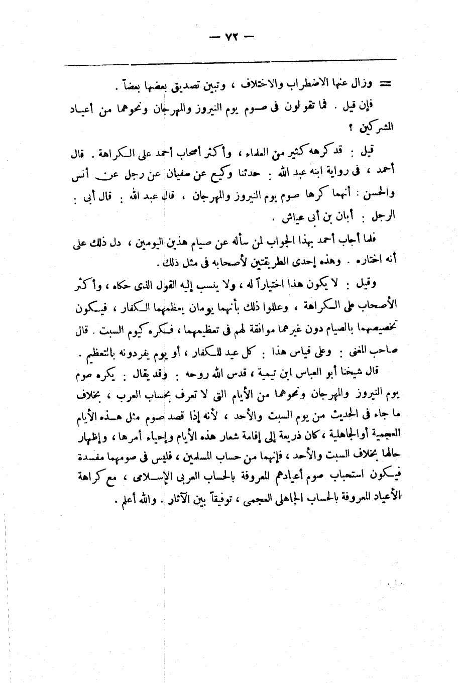 قال شيخنا أبو العباس بن تيمية قدس الله روحه وقد يقال يكره صوم يوم النيروز والمهرجان ونحوهما من الأيام التي لا تعرف بحساب العرب بخلاف ما جاء في الحديث من يوم السبت والأحد لأنه إذا قصد صوم مثل هذا الأيام العجمية أو الجاهلية كان ذريعة إلى إقامة شعار هذه الأيام وإحياء أمرها وإظهار حالها بخلاف السبت والأحد فإنهما من حساب المسلمين فليس في صومهما مفسدة فيكون استحباب صوم أعيادهم المعروفة بالحساب العربي الإسلامي مع كراهة الأعياد المعروفة بالحساب الجاهلي العجمي توفيقا بين الآثار