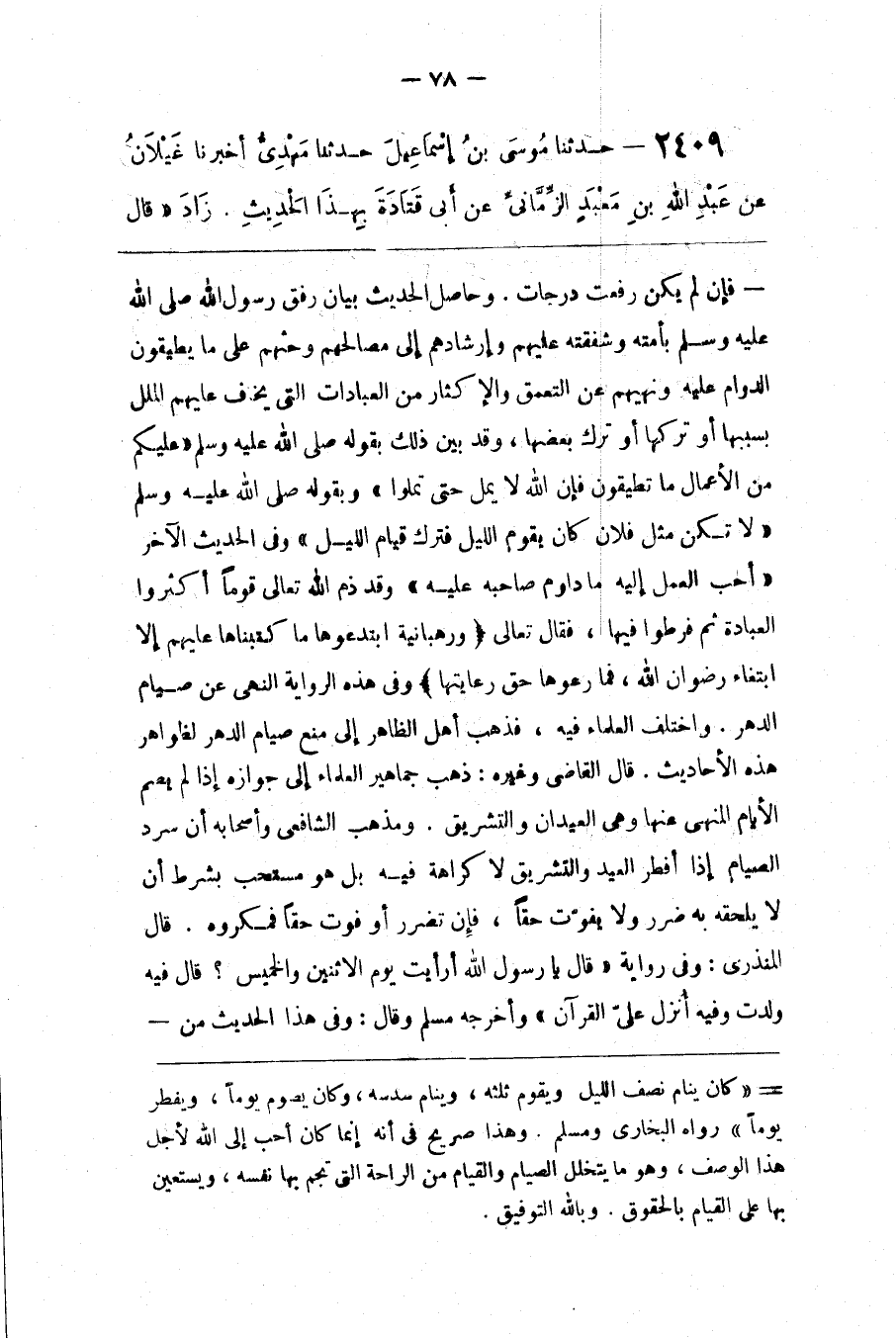 كان ينام نصف الليل ويقوم ثلثه وينام سدسه وكان يصوم يوما ويفطر يوما رواه البخاري ومسلم