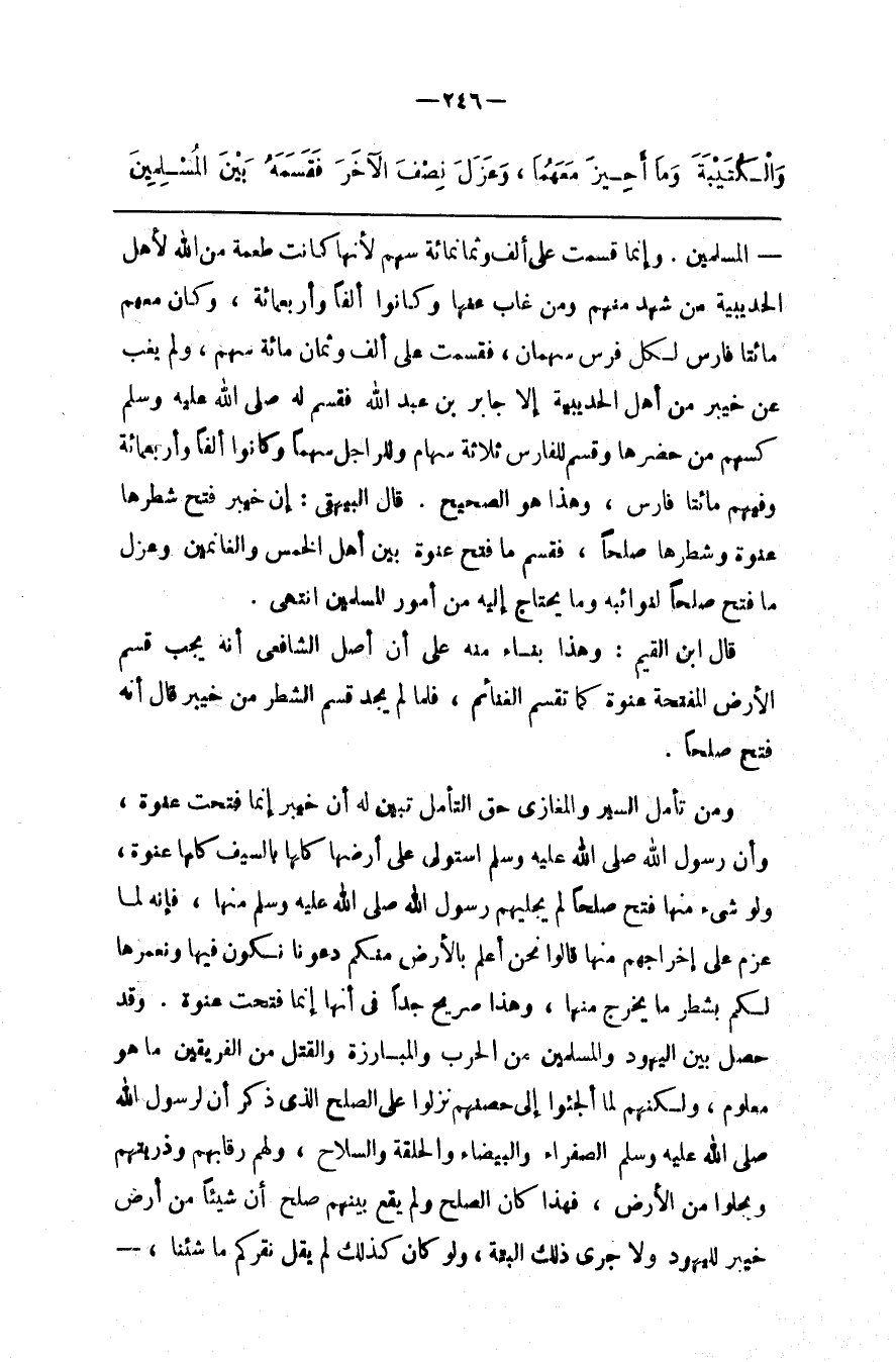 الْمُسْلِمِينَ . وَإِنَّمَا قُسِمَتْ عَلَى أَلْف وَثَمَانمِائَةِ سَهْم لِأَنَّهَا كَانَتْ طُعْمَة مِنْ اللَّه لِأَهْلِ الْحُدَيْبِيَة مَنْ شَهِدَ مِنْهُمْ وَمَنْ غَابَ عَنْهَا وَكَانُوا أَلْفًا وَأَرْبَعمِائَةِ ، وَكَانَ مَعَهُمْ مِائَتَا فَارِس لِكُلِّ فَرَس سَهْمَانِ ، فَقُسِمَتْ عَلَى أَلْف وَثَمَان مِائَة سَهْم ، وَلَمْ يَغِبْ عَنْ خَيْبَر مِنْ أَهْل الْحُدَيْبِيَة إِلَّا جَابِر بْن عَبْد اللَّه فَقَسَمَ لَهُ صَلَّى اللَّه عَلَيْهِ وَسَلَّمَ كَسَهْمِ مَنْ حَضَرَهَا وَقَسَمَ لِلْفَارِسِ ثَلَاثَة سِهَام وَلِلرَّاجِلِ سَهْمًا وَكَانُوا أَلْفًا وَأَرْبَعمِائَةٍ وَفِيهِمْ مِائَتَا فَارِس ، وَهَذَا هُوَ الصَّحِيح . قَالَ الْبَيْهَقِيُّ : إِنَّ خَيْبَر فَتَحَ شَطْرهَا عَنْوَة وَشَطْرهَا صُلْحًا ، فَقَسَمَ مَا فَتَحَ عَنْوَة بَيْن أَهْل الْخُمُس وَالْغَانِمِينَ وَعَزَلَ مَا فَتَحَ صُلْحًا لِنَوَائِبِهِ وَمَا يَحْتَاج إِلَيْهِ مِنْ أُمُور الْمُسْلِمِينَ اِنْتَهَى .