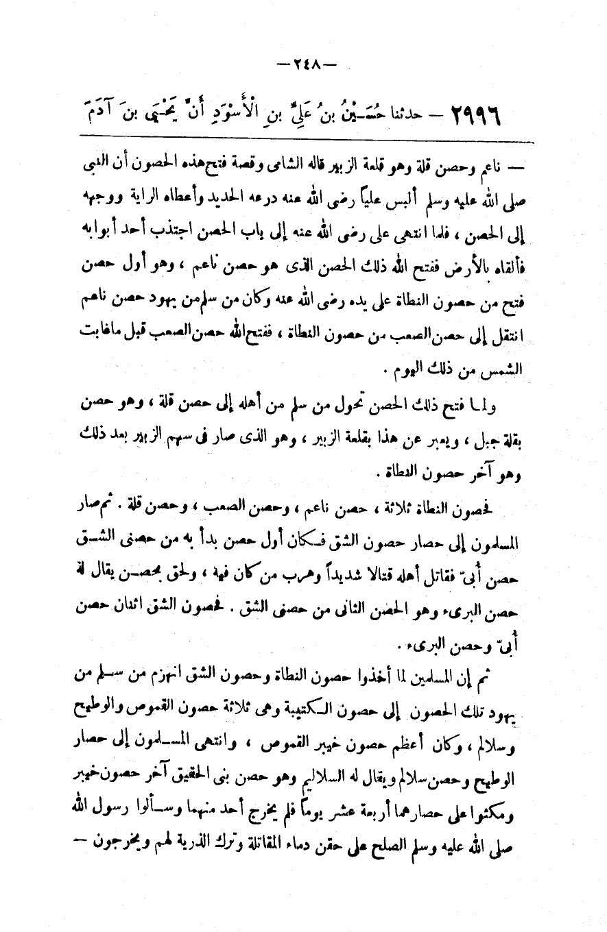 فَحُصُون النَّطَاة ثَلَاثَة ، حِصْن نَاعِم ، وَحِصْن الصَّعْب ، وَحِصْن قِلَّة . ثُمَّ صَارَ الْمُسْلِمُونَ إِلَى حِصَار حُصُون الشِّقّ فَكَانَ أَوَّل حِصْن بَدَأَ بِهِ مِنْ حِصْنَيْ الشِّقّ حِصْن أُبَيٍّ فَقَاتَلَ أَهْله قِتَالًا شَدِيدًا وَهَرَبَ مَنْ كَانَ فِيهِ ، وَلَحِقَ بِحِصْنٍ يُقَال لَهُ حِصْن الْبَرِيء وَهُوَ الْحِصْن الثَّانِي مِنْ حِصْنَيْ الشِّقّ . فَحُصُون الشِّقّ اِثْنَانِ حِصْن أُبَيٍّ وَحِصْن الْبَرِيء .