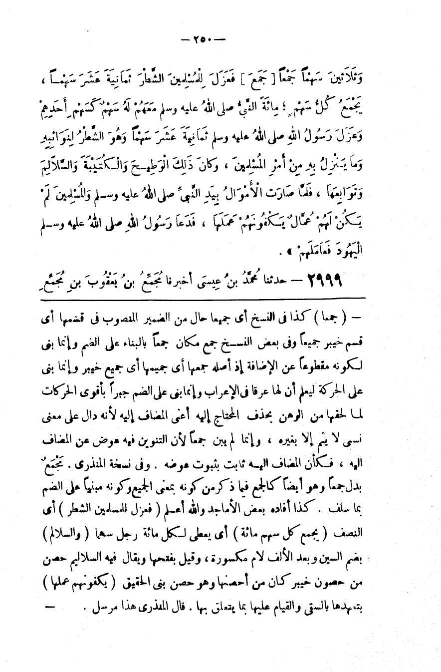 : كَذَا فِي النُّسَخ أَيْ جَمِيعًا حَال مِنْ الضَّمِير الْمَنْصُوب فِي قَسَمَهَا أَيْ قَسَمَ خَيْبَر جَمِيعًا وَفِي بَعْض النُّسَخ جَمْعُ مَكَان جَمْعًا بِالْبِنَاءِ عَلَى الضَّمّ وَإِنَّمَا بُنِيَ لِكَوْنِهِ مَقْطُوعًا عَنْ الْإِضَافَة إِذْ أَصْله جَمْعهَا أَيْ جَمِيعهَا أَيْ جَمْع خَيْبَر وَإِنَّمَا بُنِيَ عَلَى الْحَرَكَة لِيُعْلَم أَنَّ لَهَا عِرْقًا فِي الْإِعْرَاب وَإِنَّمَا بُنِيَ عَلَى الضَّمّ جَبْرًا بِأَقْوَى الْحَرَكَات لِمَا لَحِقَهَا مِنْ الْوَهْن بِحَذْفِ الْمُحْتَاج إِلَيْهِ أَعْنِي الْمُضَاف إِلَيْهِ لِأَنَّهُ دَالّ عَلَى مَعْنًى نِسْبِيّ لَا يَتِمّ إِلَّا بِغَيْرِهِ ، وَإِنَّمَا لَمْ يَبْنِ جَمْعًا لِأَنَّ التَّنْوِين فِيهِ عِوَض عَنْ الْمُضَاف إِلَيْهِ ، فَكَأَنَّ الْمُضَاف إِلَيْهِ ثَابِت بِثُبُوتِ عِوَضه .