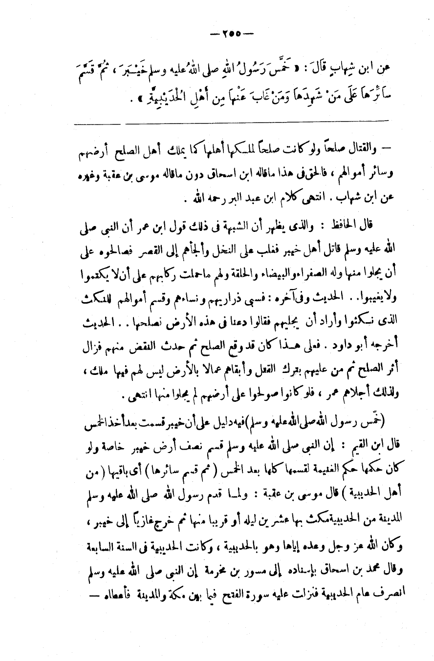 وَالْقِتَال صُلْحًا وَلَوْ كَانَتْ صُلْحًا لَمَلَكَهَا أَهْلهَا كَمَا يَمْلِك أَهْل الصُّلْح أَرْضهمْ وَسَائِر أَمْوَالهمْ ، فَالْحَقّ فِي هَذَا مَا قَالَهُ اِبْن إِسْحَاق دُون مَا قَالَهُ مُوسَى بْن عُقْبَة وَغَيْره عَنْ اِبْن شِهَاب . اِنْتَهَى كَلَام اِبْن عَبْد الْبَرّ رَحِمَهُ اللَّه .