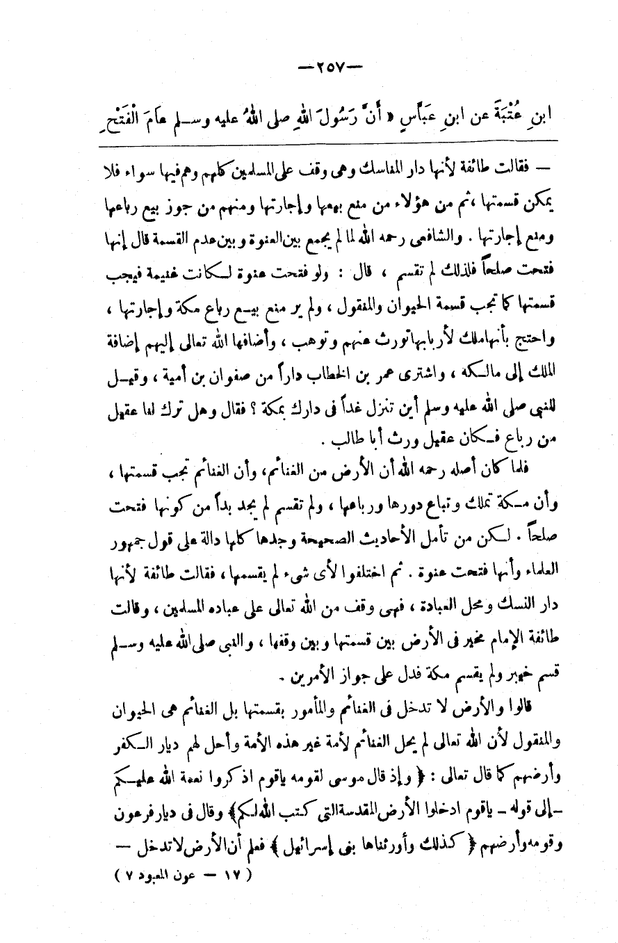 فَلَمَّا كَانَ أَصْله رَحِمَهُ اللَّه أَنَّ الْأَرْض مِنْ الْغَنَائِم ، وَأَنَّ الْغَنَائِم تَجِب قِسْمَتهَا ، وَأَنَّ مَكَّة تُمْلَك وَتُبَاع دُورهَا وَرِبَاعهَا ، وَلَمْ تُقْسَم لَمْ يَجِد بُدًّا مِنْ كَوْنهَا فُتِحَتْ صُلْحًا . لَكِنْ مَنْ تَأَمَّلَ الْأَحَادِيث الصَّحِيحَة وَجَدَهَا كُلّهَا دَالَّة عَلَى قَوْل جُمْهُور الْعُلَمَاء وَأَنَّهَا فُتِحَتْ عَنْوَة . ثُمَّ اِخْتَلَفُوا لِأَيِّ شَيْء لَمْ يَقْسِمهَا ، فَقَالَتْ طَائِفَة لِأَنَّهَا دَار النُّسُك وَمَحَلّ الْعِبَادَة ، فَهِيَ وَقْف مِنْ اللَّه تَعَالَى عَلَى عِبَاده الْمُسْلِمِينَ ، وَقَالَتْ طَائِفَة الْإِمَام مُخَيَّر فِي الْأَرْض بَيْن قِسْمَتهَا وَبَيْن وَقْفهَا ، وَالنَّبِيّ صَلَّى اللَّه عَلَيْهِ وَسَلَّمَ قَسَّمَ خَيْبَر وَلَمْ يُقَسِّم مَكَّة فَدَلَّ عَلَى جَوَاز الْأَمْرَيْنِ .