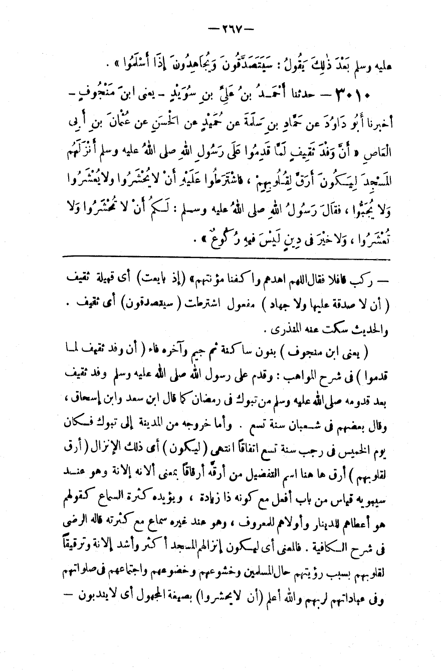 : فِي شَرْح الْمَوَاهِب : وَقَدِمَ عَلَى رَسُول اللَّه صَلَّى اللَّه عَلَيْهِ وَسَلَّمَ وَفْد ثَقِيف بَعْد قُدُومه صَلَّى اللَّه عَلَيْهِ وَسَلَّمَ مِنْ تَبُوك فِي رَمَضَان كَمَا قَالَ اِبْن سَعِيد وَابْن إِسْحَاق ، وَقَالَ بَعْضهمْ فِي شَعْبَان سَنَة تِسْع . وَأَمَّا خُرُوجه مِنْ الْمَدِينَة إِلَى تَبُوك فَكَانَ يَوْم الْخَمِيس فِي رَجَب سَنَة تِسْع اِتِّفَاقًا اِنْتَهَى