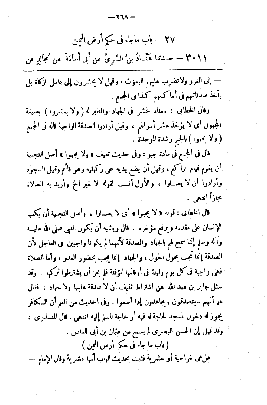 قَالَ الْخَطَّابِيُّ : قَوْله " لَا يُجَبَّوْا " أَيْ لَا يُصَلُّوا ، وَأَصْل التَّجْبِيَة أَنْ يَكُبّ الْإِنْسَان عَلَى مُقَدَّمه وَيَرْفَع مُؤَخَّره . قَالَ وَيُشْبِه أَنْ يَكُون النَّبِيّ صَلَّى اللَّه عَلَيْهِ وَآله وَسَلَّمَ إِنَّمَا سَمَحَ لَهُمْ بِالْجِهَادِ وَالصَّدَقَة لِأَنَّهُمَا لَمْ يَكُونَا وَاجِبَيْنِ فِي الْعَاجِل لِأَنَّ الصَّدَقَة إِنَّمَا تَجِب بِحَوْلِ الْحَوْل ، وَالْجِهَاد إِنَّمَا يَجِب بِحُضُورِ الْعَدُوّ ، وَأَمَّا الصَّلَاة فَهِيَ وَاجِبَة فِي كُلّ يَوْم وَلَيْلَة فِي أَوْقَاتهَا الْمُؤَقَّتَة فَلَمْ يَجُزْ أَنْ يَشْتَرِطُوا تَرْكهَا . وَقَدْ سُئِلَ جَابِر بْن عَبْد اللَّه عَنْ اِشْتِرَاط ثَقِيف أَنْ لَا صَدَقَة عَلَيْهَا وَلَا جِهَاد ، فَقَالَ عَلِمَ أَنَّهُمْ سَيَتَصَدَّقُونَ وَيُجَاهِدُونَ إِذَا أَسْلَمُوا . وَفِي الْحَدِيث مِنْ الْعِلْم أَنَّ الْكَافِر يَجُوز لَهُ دُخُول الْمَسْجِد لِحَاجَةٍ لَهُ فِيهِ أَوْ لِحَاجَةِ الْمُسْلِم إِلَيْهِ اِنْتَهَى . قَالَ الْمُنْذِرِيُّ : وَقَدْ قِيلَ إِنَّ الْحَسَن الْبَصْرِيّ لَمْ يَسْمَع مِنْ عُثْمَان بْنِ أَبِي الْعَاصِ .