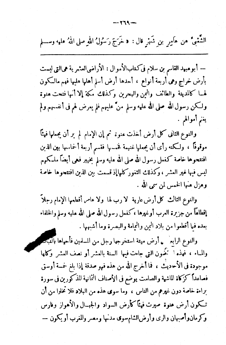 وَالنَّوْع الرَّابِع : كُلّ أَرْض مَيْتَة اِسْتَخْرَجَهَا رَجُل مِنْ الْمُسْلِمِينَ فَأَحْيَاهَا بِالنَّبَاتِ وَالْمَاء ، فَهَذِهِ الْأَرْضُونَ الَّتِي جَاءَتْ فِيهَا السُّنَّة بِالْعُشْرِ أَوْ نِصْف الْعُشْر وَكُلّهَا مَوْجُودَة فِي الْأَحَادِيث ، فَمَا أَخْرَجَ اللَّه مِنْ هَذِهِ فَهُوَ صَدَقَة إِذَا بَلَغَ خَمْسَة أَوْسُق فَصَاعِدًا كَزَكَاةِ الْمَاشِيَة وَالصَّامِت يُوضَع فِي الْأَصْنَاف الثَّمَانِيَة الْمَذْكُورِينَ فِي سُورَة بَرَاءَة خَاصَّة دُون غَيْرهمْ مِنْ النَّاس ، وَمَا سِوَى هَذِهِ مِنْ الْبِلَاد فَلَا تَخْلُوا مِنْ أَنْ تَكُون أَرْض عَنْوَة صُيِّرَتْ فَيْئًا كَأَرْضِ السَّوَاد وَالْجِبَال وَالْأَهْوَاز وَفَارِس وَكَرْمَانِ وَأَصْبَهَان وَالرَّيّ وَأَرْض الشَّام سِوَى مُدُنهَا وَمِصْر وَالْمَغْرِب أَوْ يَكُون@
