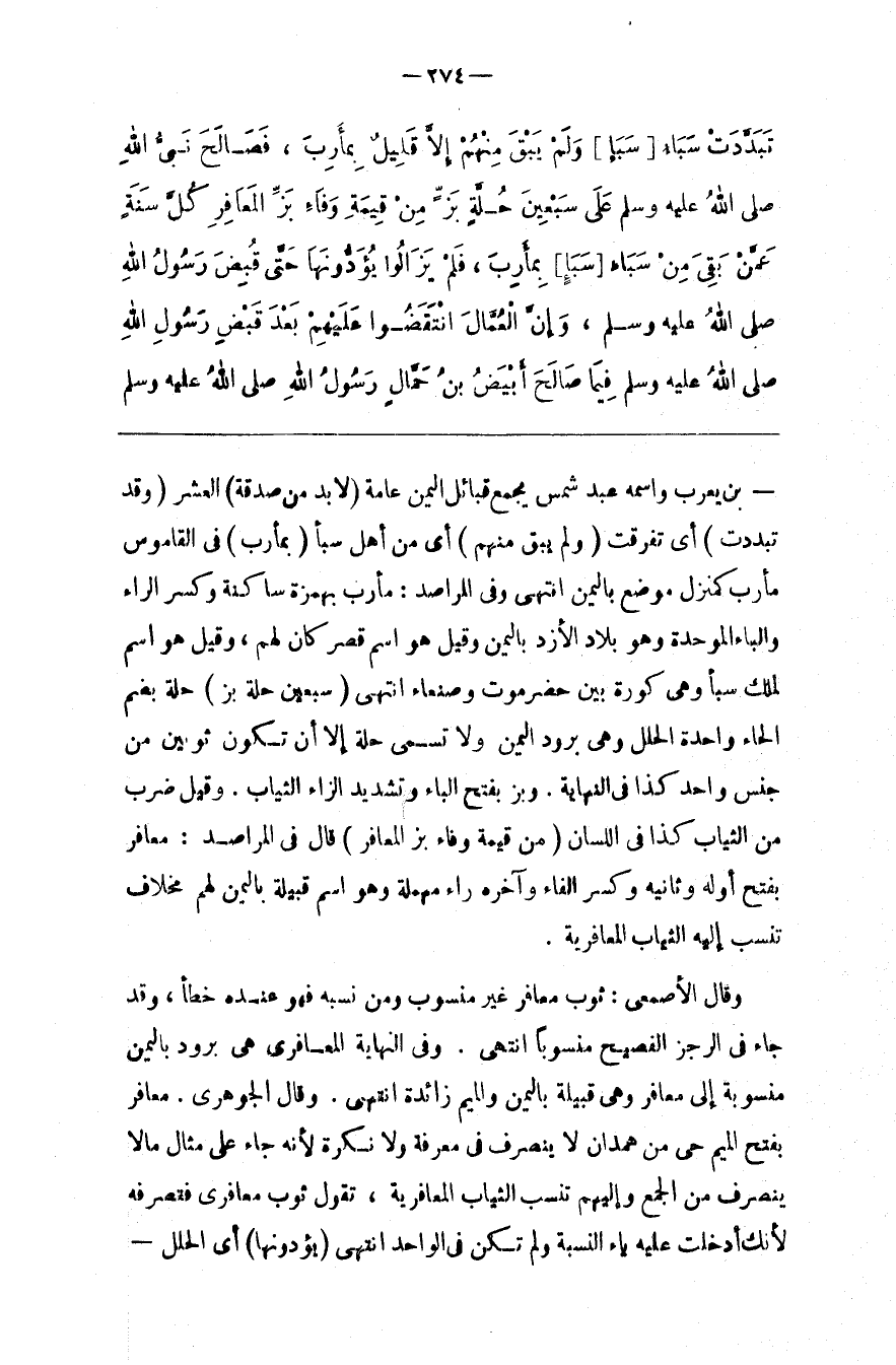 : قَالَ فِي الْمَرَاصِد : مَعَافِر بِفَتْحِ أَوَّله وَثَانِيه وَكَسْر الْفَاء وَآخِره رَاء مُهْمَلَة وَهُوَ اِسْم قَبِيلَة بِالْيَمَنِ لَهُمْ مِخْلَاف تُنْسَب إِلَيْهِ الثِّيَاب الْمَعَافِرِيَّةُ .