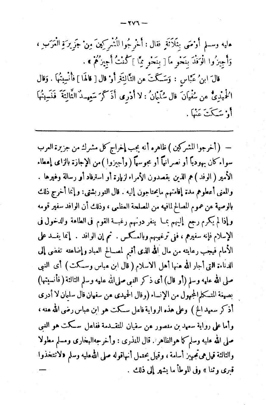 : ظَاهِره أَنَّهُ يَجِب إِخْرَاج كُلّ مُشْرِك مِنْ جَزِيرَة الْعَرَب سَوَاء كَانَ يَهُودِيًّا أَوْ نَصْرَانِيًّا أَوْ مَجُوسِيًّا