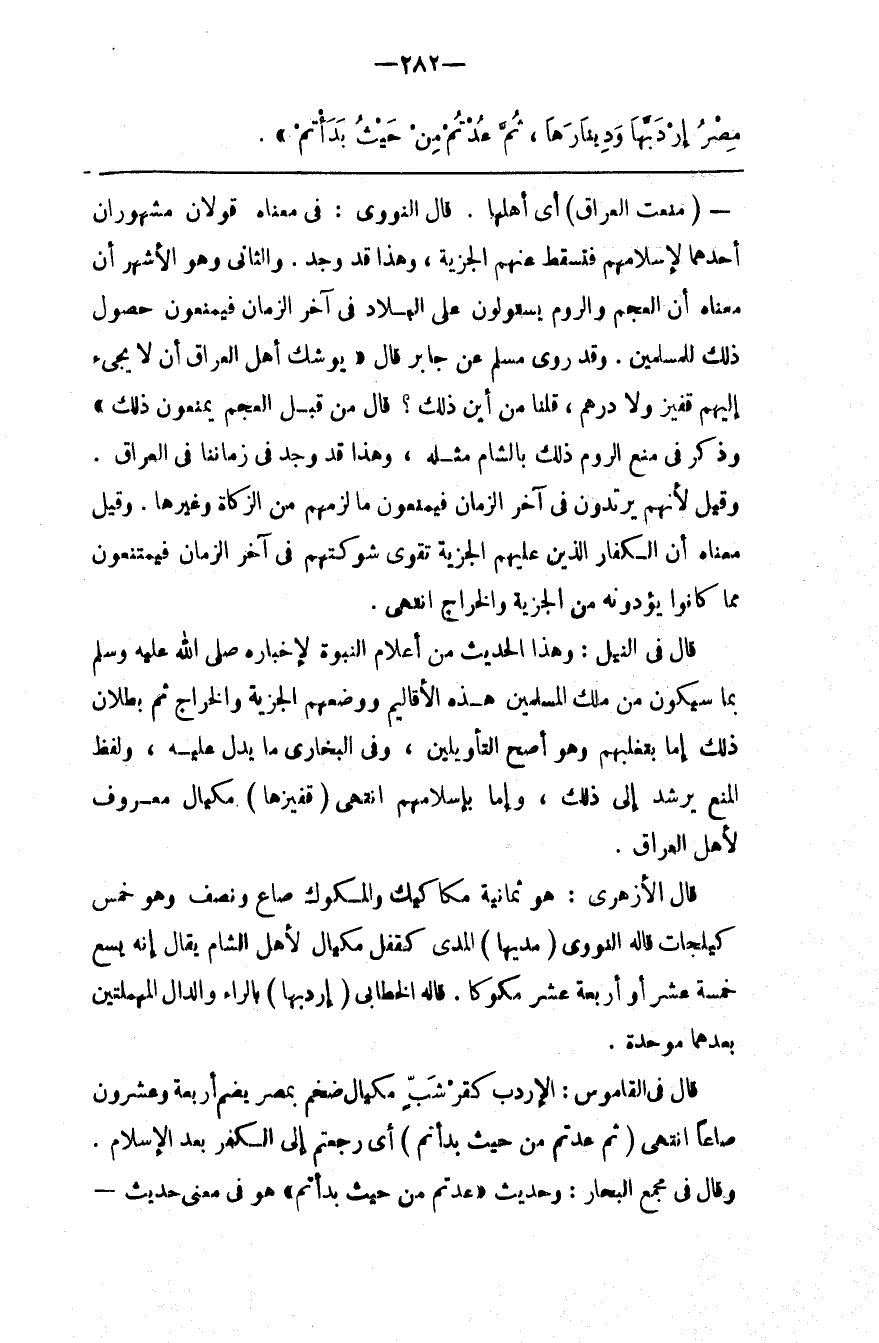 قَالَ فِي النَّيْل : وَهَذَا الْحَدِيث مِنْ أَعْلَام النُّبُوَّة لِإِخْبَارِهِ صَلَّى اللَّه عَلَيْهِ وَسَلَّمَ بِمَا سَيَكُونُ مِنْ مِلْك الْمُسْلِمِينَ هَذِهِ الْأَقَالِيم وَوَضْعهمْ الْجِزْيَة وَالْخَرَاج ثُمَّ بُطْلَان ذَلِكَ إِمَّا بِتَغَلُّبِهِمْ وَهُوَ أَصَحّ التَّأْوِيلَيْنِ ، وَفِي الْبُخَارِيّ مَا يَدُلّ عَلَيْهِ ، وَلَفْظ الْمَنْع يُرْشِد إِلَى ذَلِكَ ، وَإِمَّا بِإِسْلَامِهِمْ اِنْتَهَى
