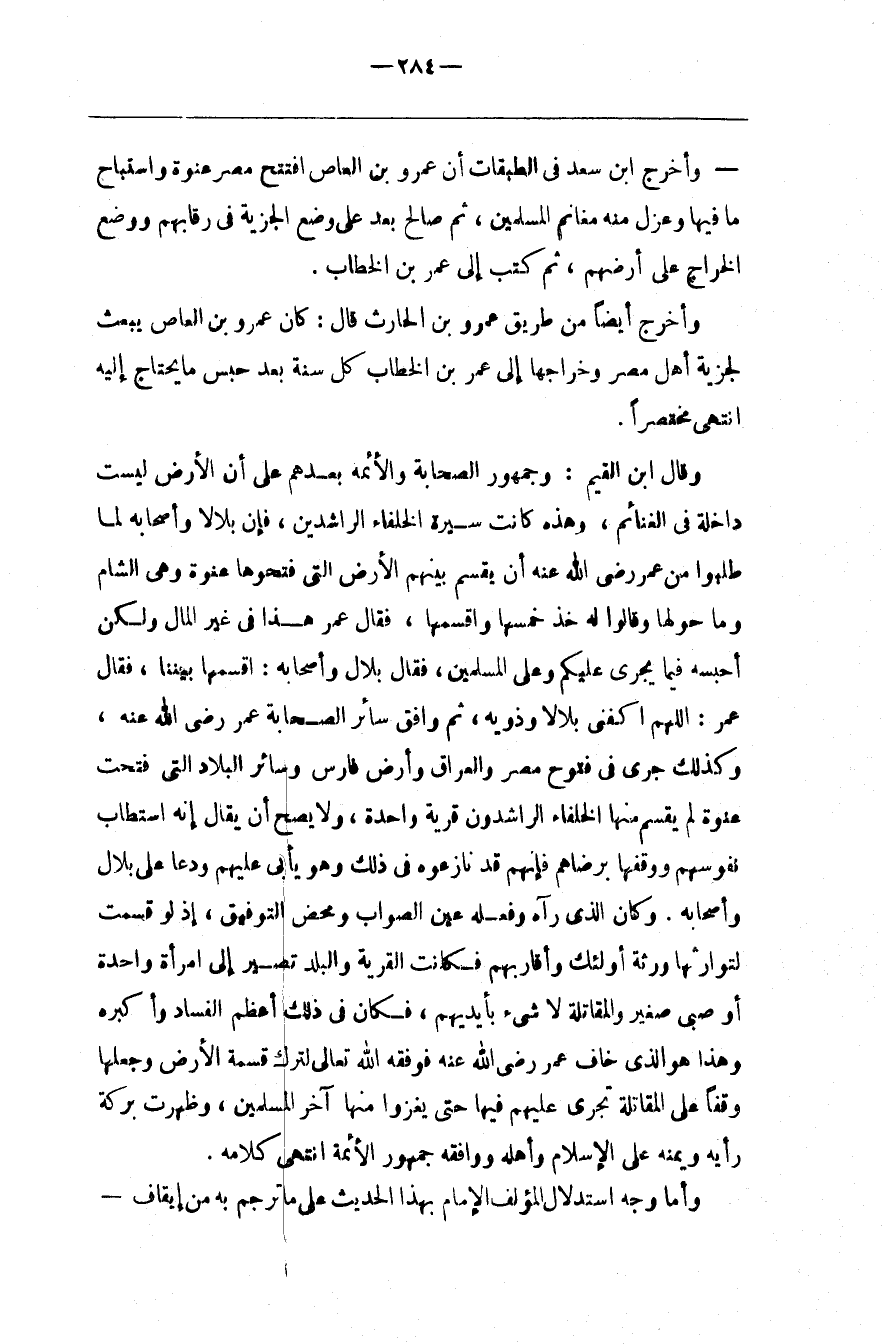 وَقَالَ اِبْن الْقَيِّم : وَجُمْهُور الصَّحَابَة وَالْأَئِمَّة بَعْدهمْ عَلَى أَنَّ الْأَرْض لَيْسَتْ دَاخِلَة فِي الْغَنَائِم ، وَهَذِهِ كَانَتْ سِيرَة الْخُلَفَاء الرَّاشِدِينَ ، فَإِنَّ بِلَالًا وَأَصْحَابه لَمَّا طَلَبُوا مِنْ عُمَر رَضِيَ اللَّه عَنْهُ أَنْ يُقَسِّم بَيْنهمْ الْأَرْض الَّتِي فَتَحُوهَا عَنْوَة وَهِيَ الشَّام وَمَا حَوْلهَا وَقَالُوا لَهُ خُذْ خُمُسهَا وَاقْسِمْهَا ، فَقَالَ عُمَر هَذَا فِي غَيْر الْمَال وَلَكِنْ أَحْبِسهُ فِيمَا يَجْرِي عَلَيْكُمْ وَعَلَى الْمُسْلِمِينَ ، فَقَالَ بِلَال وَأَصْحَابه : اِقْسِمْهَا بَيْننَا ، فَقَالَ عُمَر : اللَّهُمَّ اِكْفِنِي بِلَالًا وَذَوِيهِ ، ثُمَّ وَافَقَ سَائِر الصَّحَابَة عُمَر رَضِيَ اللَّه عَنْهُ ، وَكَذَلِكَ جَرَى فِي فُتُوح مِصْر وَالْعِرَاق وَأَرْض فَارِس وَسَائِر الْبِلَاد الَّتِي فُتِحَتْ عَنْوَة لَمْ يَقْسِم مِنْهَا الْخُلَفَاء الرَّاشِدُونَ قَرْيَة وَاحِدَة ، وَلَا يَصِحّ أَنْ يُقَال إِنَّهُ اِسْتَطَابَ نُفُوسهمْ وَوَقَفَهَا بِرِضَاهُمْ فَإِنَّهُمْ قَدْ نَازَعُوهُ فِي ذَلِكَ وَهُوَ يَأْبَى عَلَيْهِمْ وَدَعَا عَلَى بِلَال وَأَصْحَابه . وَكَانَ الَّذِي رَآهُ وَفَعَلَهُ عَيْن الصَّوَاب وَمَحْض التَّوْفِيق ، إِذْ لَوْ قُسِّمَتْ لَتَوَارَثَهَا وَرَثَة أُولَئِكَ وَأَقَارِبهمْ فَكَانَتْ الْقَرْيَة وَالْبَلَد تَصِير إِلَى اِمْرَأَة وَاحِدَة أَوْ صَبِيّ صَغِير وَالْمُقَاتِلَة لَا شَيْء بِأَيْدِيهِمْ ، فَكَانَ فِي ذَلِكَ أَعْظَم الْفَسَاد وَأَكْبَره وَهَذَا هُوَ الَّذِي خَافَ عُمَر رَضِيَ اللَّه عَنْهُ فَوَفَّقَهُ اللَّه تَعَالَى لِتَرْكِ قِسْمَة الْأَرْض وَجَعْلهَا وَقْفًا عَلَى الْمُقَاتِلَة تَجْرِي عَلَيْهِمْ فِيهَا حَتَّى يَغْزُوا مِنْهَا آخِر الْمُسْلِمِينَ ، وَظَهَرَتْ بَرَكَة رَأْيه وَيُمْنه عَلَى الْإِسْلَام وَأَهْله وَوَافَقَهُ جُمْهُور الْأَئِمَّة اِنْتَهَى كَلَامه .