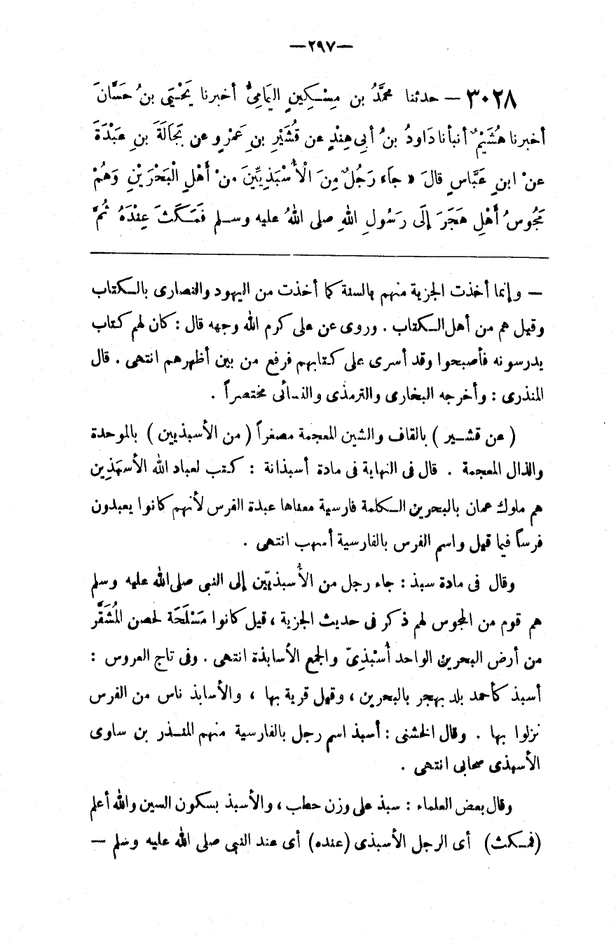 وَقَالَ فِي مَادَّة سَبَذَ : جَاءَ رَجُل مِنْ الْأَسْبَذِيِّينَ إِلَى النَّبِيّ صَلَّى اللَّه عَلَيْهِ وَسَلَّمَ هُمْ قَوْم مِنْ الْمَجُوس لَهُمْ ذِكْر فِي حَدِيث الْجِزْيَة ، قِيلَ كَانُوا مَسْلَحَة لِحِصْنِ الْمُشَقَّر مِنْ أَرْض الْبَحْرَيْنِ الْوَاحِد أَسْبَذِيّ وَالْجَمْع الْأَسَابِذَة اِنْتَهَى . وَفِي تَاج الْعَرُوس : أَسْبَذ كَأَحْمَد بَلَد بِهَجَرَ بِالْبَحْرَيْنِ ، وَقِيلَ قَرْيَة بِهَا ، وَالْأَسَابِذ نَاس مِنْ الْفُرْس نَزَلُوا بِهَا . وَقَالَ الْخُشَنِيُّ : أَسْبَذ اِسْم رَجُل بِالْفَارِسِيَّةِ مِنْهُمْ الْمُنْذِر بْن سَاوَى الْأَسْبَذِيّ صَحَابِيّ اِنْتَهَى .
