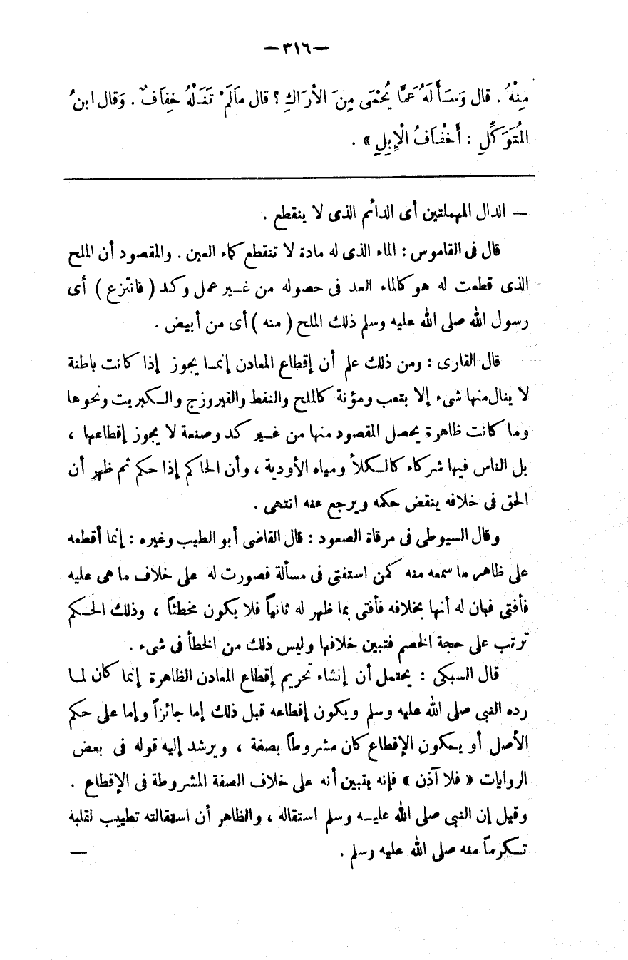 وَقَالَ السُّيُوطِيُّ فِي مِرْقَاة الصُّعُود : قَالَ الْقَاضِي أَبُو الطَّيِّب وَغَيْره : إِنَّمَا أَقْطَعَهُ عَلَى ظَاهِر مَا سَمِعَهُ مِنْهُ كَمَنْ اُسْتُفْتِيَ فِي مَسْأَلَة فَصُوِّرَتْ لَهُ عَلَى خِلَاف مَا هِيَ عَلَيْهِ فَأَفْتَى فَبَانَ لَهُ أَنَّهَا بِخِلَافِهِ فَأَفْتَى بِمَا ظَهَرَ لَهُ ثَانِيًا فَلَا يَكُون مُخْطِئًا ، وَذَلِكَ الْحُكْم تَرَتَّبَ عَلَى حُجَّة الْخَصْم فَتَبَيَّنَ خِلَافهَا وَلَيْسَ ذَلِكَ مِنْ الْخَطَأ فِي شَيْء . قَالَ السُّبْكِيُّ : يَحْتَمِل أَنَّ إِنْشَاء تَحْرِيم إِقْطَاع الْمَعَادِن الظَّاهِرَة إِنَّمَا كَانَ لَمَّا رَدَّهُ النَّبِيّ صَلَّى اللَّه عَلَيْهِ وَسَلَّمَ وَيَكُون إِقْطَاعه قَبْل ذَلِكَ إِمَّا جَائِزًا وَإِمَّا عَلَى حُكْم الْأَصْل أَوْ يَكُون الْإِقْطَاع كَانَ مَشْرُوطًا بِصِفَةٍ ، وَيُرْشِد إِلَيْهِ قَوْله فِي بَعْض الرِّوَايَات " فَلَا آذَن " فَإِنَّهُ يَتَبَيَّن أَنَّهُ عَلَى خِلَاف الصِّفَة الْمَشْرُوطَة فِي الْإِقْطَاع . وَقِيلَ إِنَّ النَّبِيّ صَلَّى اللَّه عَلَيْهِ وَسَلَّمَ اِسْتَقَالَهُ ، وَالظَّاهِر أَنَّ اِسْتِقَالَته تَطْيِيب لِقَلْبِهِ تَكَرُّمًا مِنْهُ صَلَّى اللَّه عَلَيْهِ وَسَلَّمَ .@