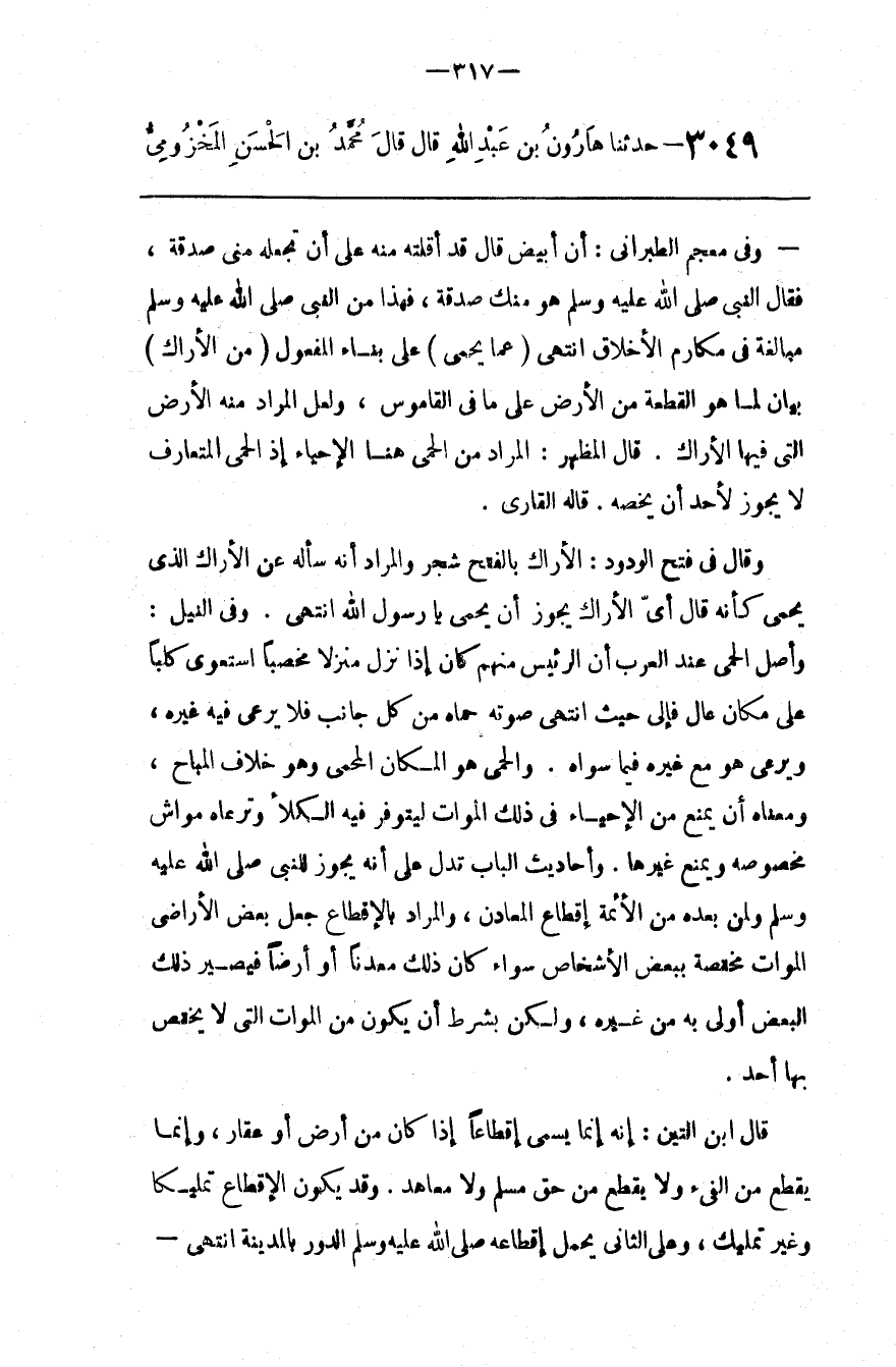 وَالْحِمَى هُوَ الْمَكَان الْمَحْمِيّ وَهُوَ خِلَاف الْمُبَاح ، وَمَعْنَاهُ أَنْ يَمْنَع مِنْ الْإِحْيَاء فِي ذَلِكَ الْمَوَات لِيَتَوَفَّر فِيهِ الْكَلَأ وَتَرْعَاهُ مَوَاشٍ مَخْصُوصَة وَيَمْنَع غَيْرهَا . وَأَحَادِيث الْبَاب تَدُلّ عَلَى أَنَّهُ يَجُوز لِلنَّبِيِّ صَلَّى اللَّه عَلَيْهِ وَسَلَّمَ وَلِمَنْ بَعْده مِنْ الْأَئِمَّة إِقْطَاع الْمَعَادِن ، وَالْمُرَاد بِالْإِقْطَاعِ جَعْل بَعْض الْأَرَاضِي الْمَوَات مُخْتَصَّة بِبَعْضِ الْأَشْخَاص سَوَاء كَانَ ذَلِكَ مَعْدِنًا أَوْ أَرْضًا فَيَصِير ذَلِكَ الْبَعْض أَوْلَى بِهِ مِنْ غَيْره ، وَلَكِنْ بِشَرْطِ أَنْ يَكُون مِنْ الْمَوَات الَّتِي لَا يَخْتَصّ بِهَا أَحَد .