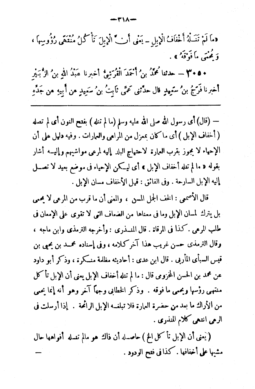قَالَ الْمُنْذِرِيُّ : وَأَخْرَجَهُ التِّرْمِذِيّ وَابْن مَاجَهْ ، وَقَالَ التِّرْمِذِيّ حَسَن غَرِيب هَذَا آخِر كَلَامه ، وَفِي إِسْنَاده مُحَمَّد بْن يَحْيَى بْن قَيْس السَّبَائِيّ الْمَأْرِبِيّ . قَالَ اِبْن عَدِيّ : أَحَادِيثه مُظْلِمَة مُنْكَرَة ، وَذَكَرَ أَبُو دَاوُدَ عَنْ مُحَمَّد بْن الْحَسَن الْمَخْزُومِيّ قَالَ : مَا لَمْ تَنَلْهُ أَخْفَاف الْإِبِل يَعْنِي أَنَّ الْإِبِل تَأْكُل مُنْتَهَى رُءُوسهَا وَيَحْمِي مَا فَوْقه . وَذَكَرَ الْخَطَّابِيُّ وَجْهًا آخَر وَهُوَ أَنَّهُ إِنَّمَا يَحْمِي مِنْ الْأَرَاك مَا بَعُدَ مِنْ حَضْرَة الْعِمَارَة فَلَا تَبْلُغهُ الْإِبِل الرَّائِحَة . إِذَا أُرْسِلَتْ فِي الرَّعْي اِنْتَهَى كَلَام الْمُنْذِرِيِّ .