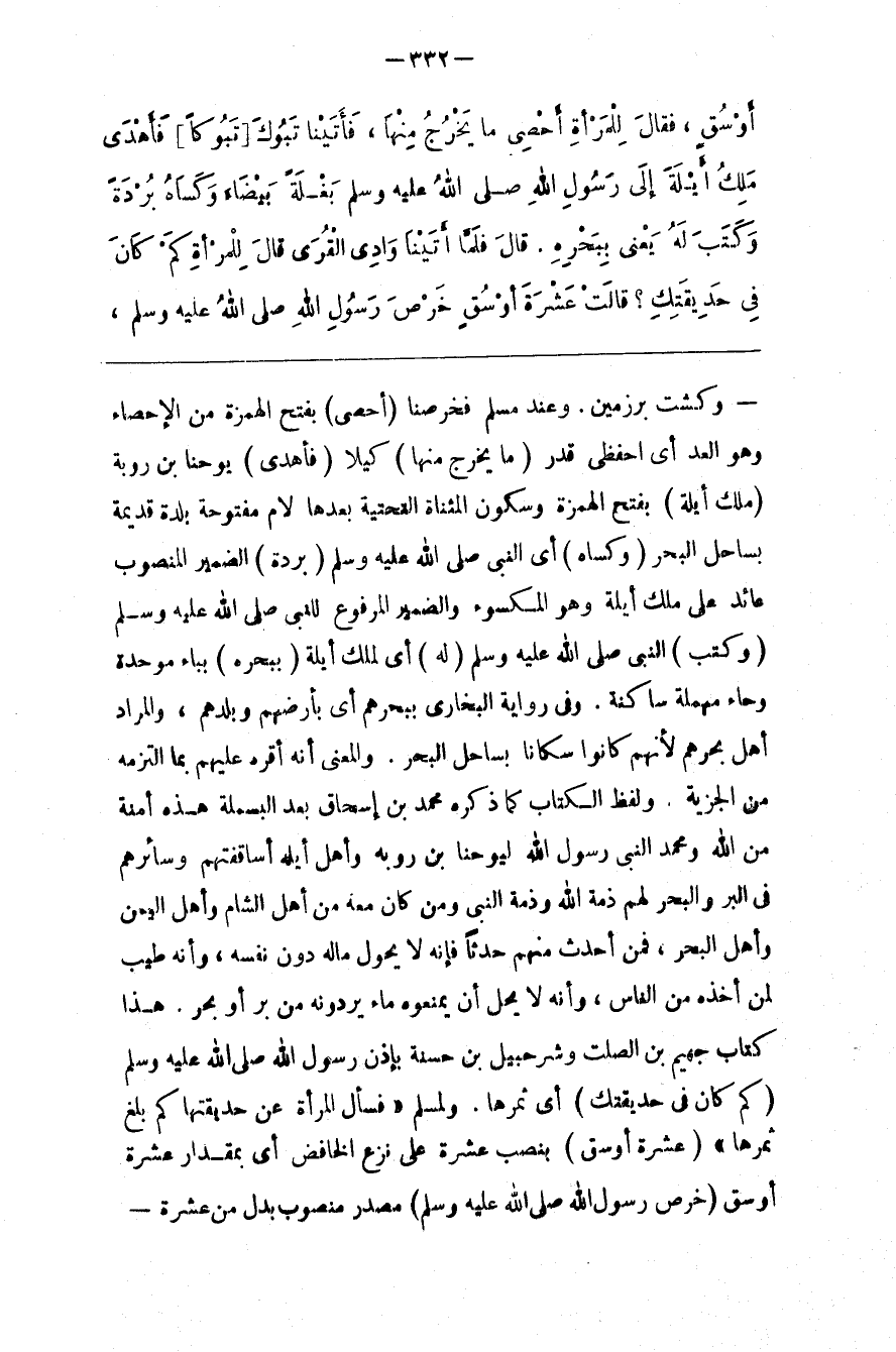 : بِبَاءٍ مُوَحَّدَة وَحَاء مُهْمَلَة سَاكِنَة . وَفِي رِوَايَة الْبُخَارِيّ بِبَحْرِهِمْ أَيْ بِأَرْضِهِمْ وَبَلَدهمْ ، وَالْمُرَاد أَهْل بَحْرهمْ لِأَنَّهُمْ كَانُوا سَكَّانَا بِسَاحِلِ الْبَحْر . وَالْمَعْنَى أَنَّهُ أَقَرَّهُ عَلَيْهِمْ بِمَا اِلْتَزَمَهُ مِنْ الْجِزْيَة . وَلَفْظ الْكِتَاب كَمَا ذَكَرَهُ مُحَمَّد بْن إِسْحَاق بَعْد الْبَسْمَلَة هَذِهِ أَمَنَة مِنْ اللَّه وَمُحَمَّد النَّبِيّ صَلَّى اللَّه عَلَيْهِ وَسَلَّمَ رَسُول اللَّه صَلَّى اللَّه عَلَيْهِ وَسَلَّمَ لِيُوحَنَّا بْن رَوْبَة وَأَهْل أَيْلَة أَسَاقِفَتهمْ وَسَائِرهمْ فِي الْبَرّ وَالْبَحْر لَهُمْ ذِمَّة اللَّه وَذِمَّة النَّبِيّ صَلَّى اللَّه عَلَيْهِ وَسَلَّمَ وَمَنْ كَانَ مَعَهُ مِنْ أَهْل الشَّام وَأَهْل الْيَمَن وَأَهْل الْبَحْر ، فَمَنْ أَحْدَثَ مِنْهُمْ حَدَثًا فَإِنَّهُ لَا يَحُول مَاله دُون نَفْسه ، وَأَنَّهُ طَيِّب لِمَنْ أَخَذَهُ مِنْ النَّاس ، وَأَنَّهُ لَا يَحِلّ أَنْ يَمْنَعُوهُ مَاء يَرِدُونَهُ مِنْ بَرّ أَوْ بَحْر . هَذَا كِتَاب جُهَيْم بْن الصَّلْت وَشُرَحْبِيل بْن حَسَنَة بِإِذْنِ رَسُول اللَّه صَلَّى اللَّه عَلَيْهِ وَسَلَّمَ