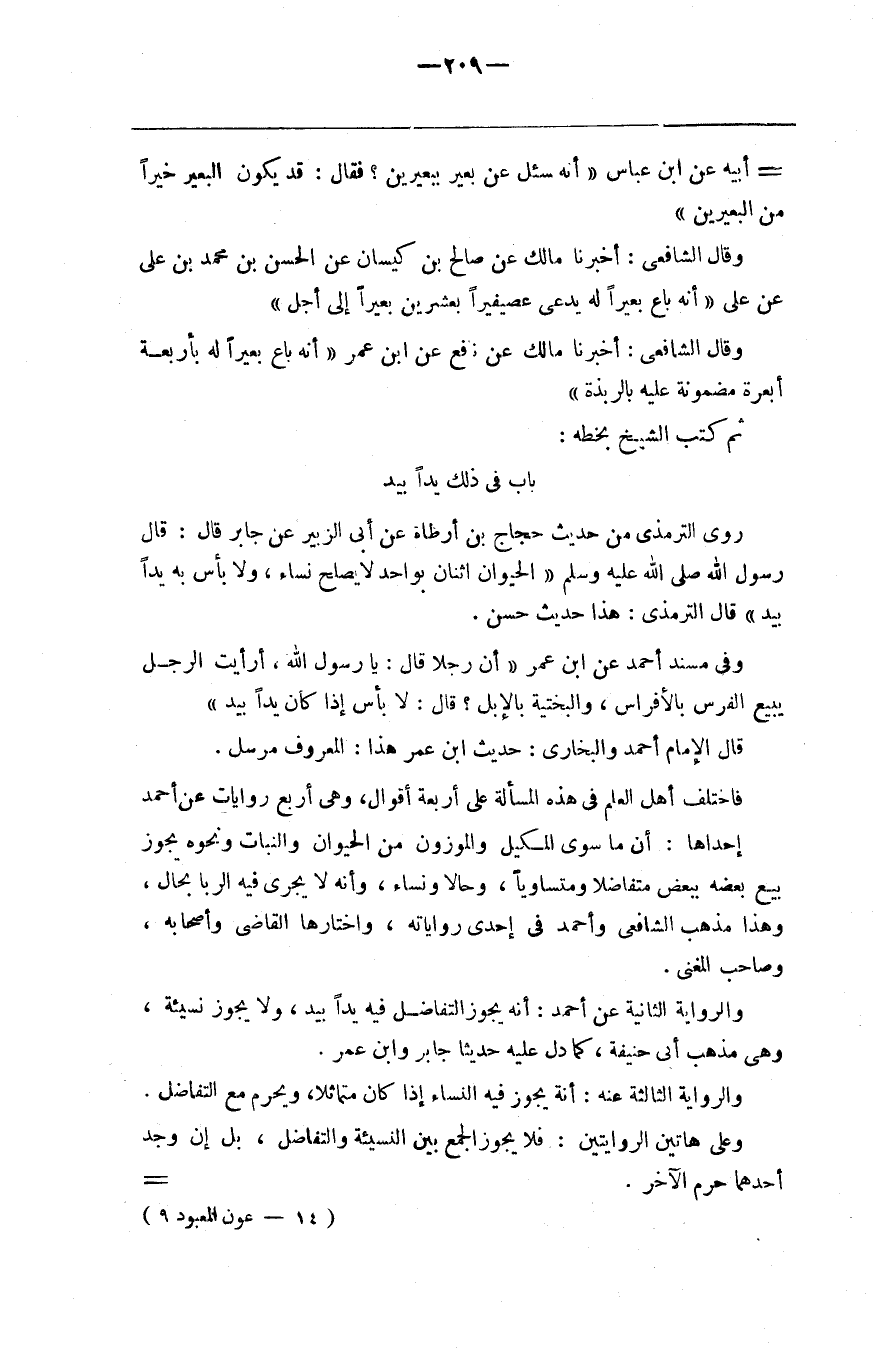 وفي مسند أحمد عن ابن عمر أن رجلا قال يارسول الله أرأيت الرجل يبيع الفرس بالأفراس والبختية بالإبل قال لا بأس إذا كان يدا بيد