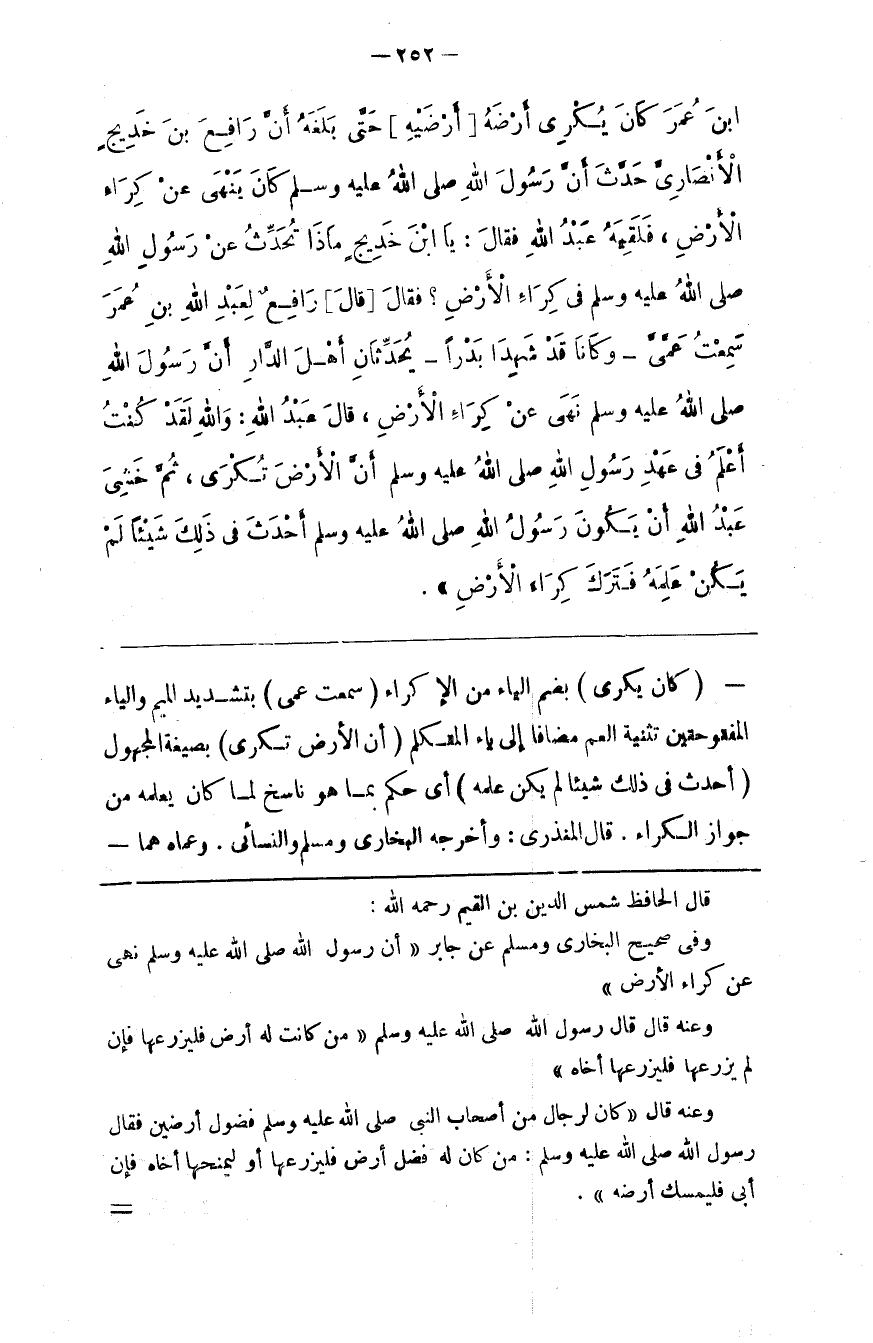 قال الحافظ شمس الدين بن القيم رحمه الله وفي صحيح البخاري ومسلم عن جابر أن رسول الله صلى الله عليه و سلم نهى عن كراء الأرض