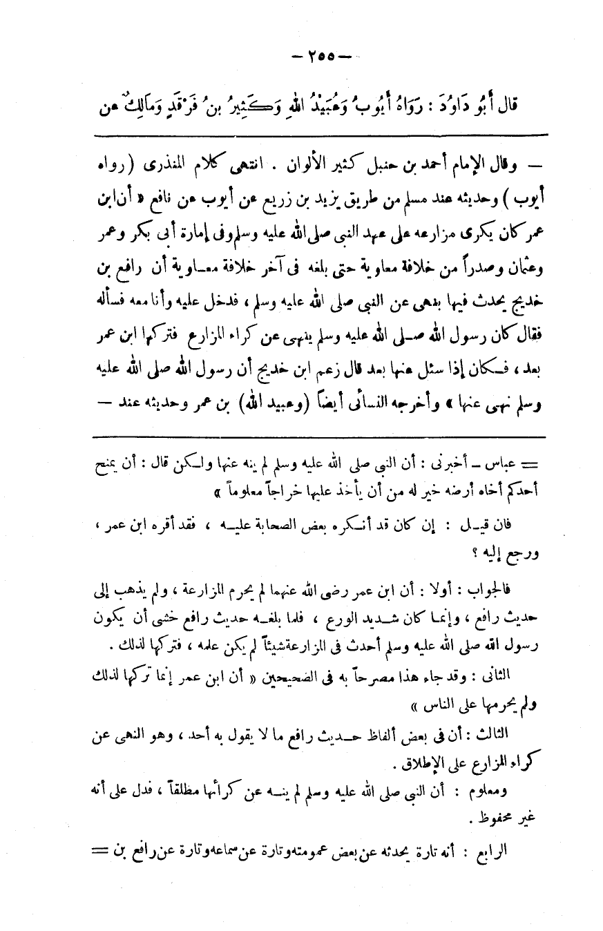 فإن قيل إن كان قد أنكره بعض الصحابة عليه فقد أقره ابن عمر ورجع إليه فالجواب أولا أن ابن عمر رضي الله عنهما لم يحرم المزارعة ولم يذهب إلى حديث رافع وإنما كان شديد الورع فلما بلغه حديث رافع خشي أن يكون رسول الله صلى الله عليه و سلم أحدث في المزارعة شيئا لم يكن علمه فتركها لذلك