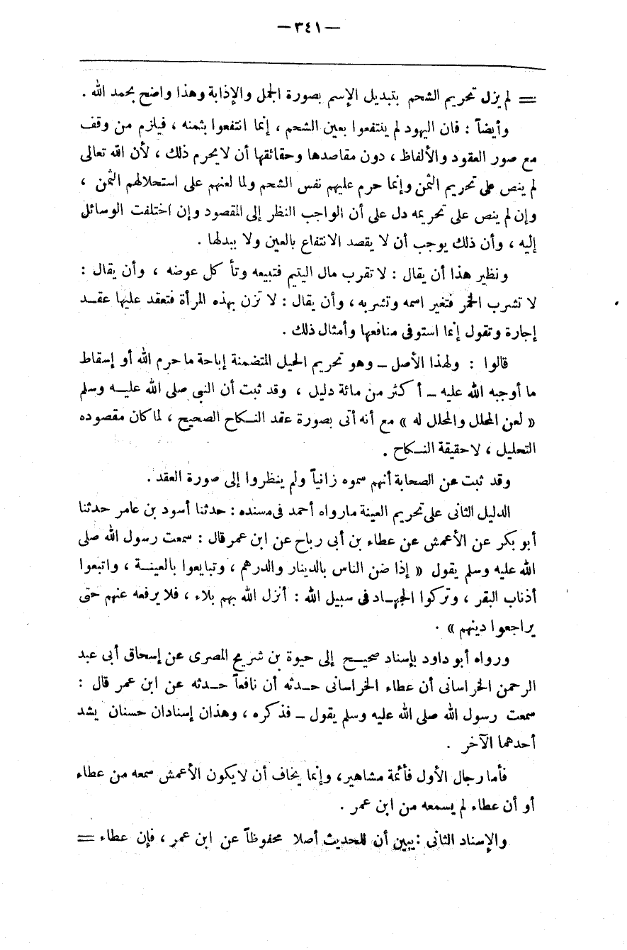 قالوا ولهذا الأصل وهو تحريم الحيل المتضمنة إباحة ما حرم الله أو إسقاط ما أوجبه الله عليه أكثر من مائة دليل وقد ثبت أن النبي لعن المحلل والمحلل له مع أنه أتى بصورة عقد النكاح الصحيح لما كان مقصوده التحليل لا حقيقة النكاح