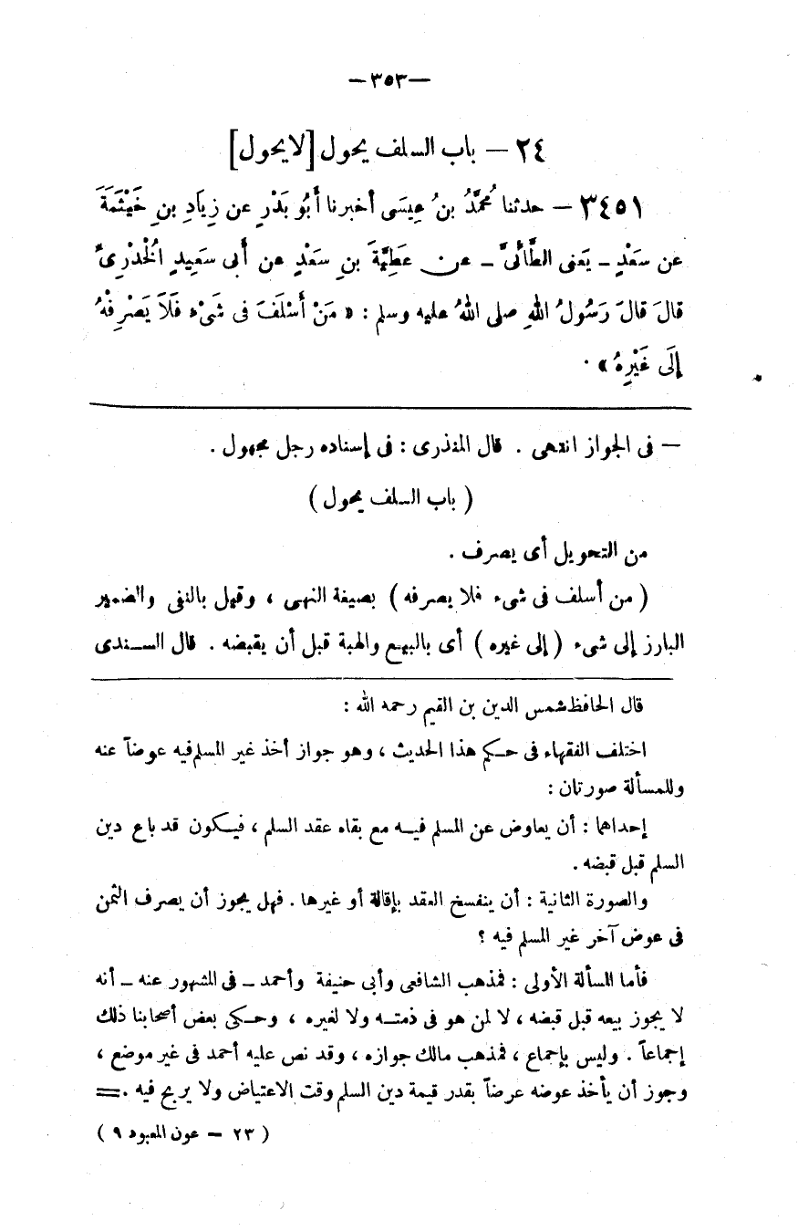 اختلف الفقهاء في حكم هذا الحديث وهو جواز أخذ غير المسلم فيه عوضا عنه وللمسألة صورتان إحداهما أن يعاوض عن المسلم فيه مع بقاء عقد السلم فيكون قد باع دين السلم قبل قبضه