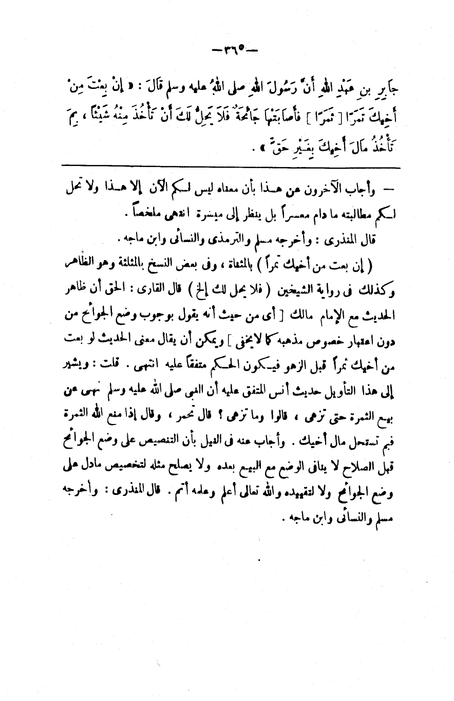 مُسْلِم فِي صَحِيحه مِنْ هَذَا الْوَجْه " الشُّفْعَة فِي كُلّ شِرْك فِي أَرْض أَوْ رَبْع أَوْ حَائِط لَا يَصْلُح أَنْ يَبِيع حَتَّى يَعْرِض عَلَى شَرِيكه فَيَأْخُذ أَوْ يَدَع فَإِنْ أَبَى فَشَرِيكه أَحَقّ بِهِ حَتَّى يُؤْذِنهُ " قَالَ الْمُنْذِرِيّ : وَأَخْرَجَهُ مُسْلِم وَالنَّسَائِيّ .@