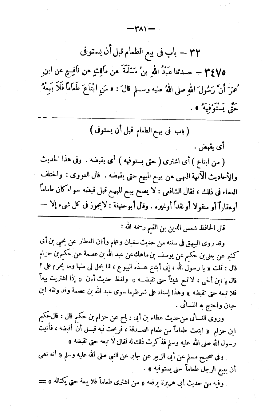 قال الحافظ شمس الدين بن القيم رحمه الله وقد روى البيهقي في سننه من حديث سفيان وهمام وأبان العطار عن يحيى بن أبي كثير عن يعلى بن حكيم عن يوسف بن ماهك عن عبد الله بن عصمة عن حكيم بن حزام قال قلت يارسول الله إني أبتاع هذه البيوع فما يحل لي منها وما يحرم علي قال ياابن أخي لا تبع شيئا حتى تقبضه ولفظ حديث أبان إذا اشتريت بيعا فلا تبعه حتى تقبضه وهذا إسناد على شرطهما سوى عبد الله بن عصمة وقد وثقه ابن حبان واحتج به النسائي