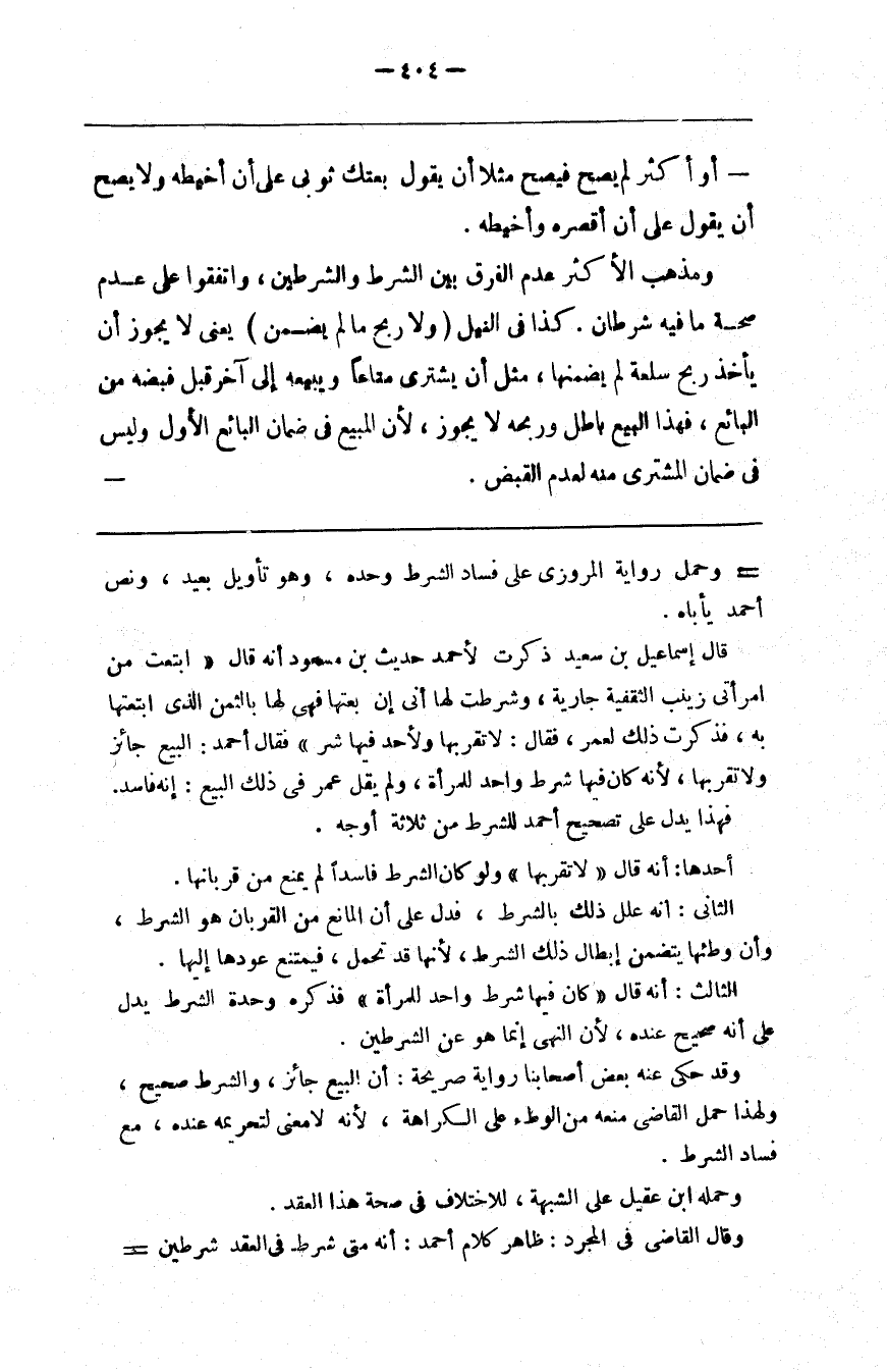 قال إسماعيل بن سعيد ذكرت لأحمد حديث ابن مسعود أنه قال ابتعت من امرأتي زينب الثقفية جارية وشرطت لها أني إن بعتها فهي لها بالثمن الذي ابتعتها به فذكرت ذلك لعمر فقال لا تقربها ولأحد فيها شرط فقال أحمد البيع جائز ولا تقربها لأنه كان فيها شرط واحد للمرأة ولم يقل عمر في ذلك البيع إنه فاسد