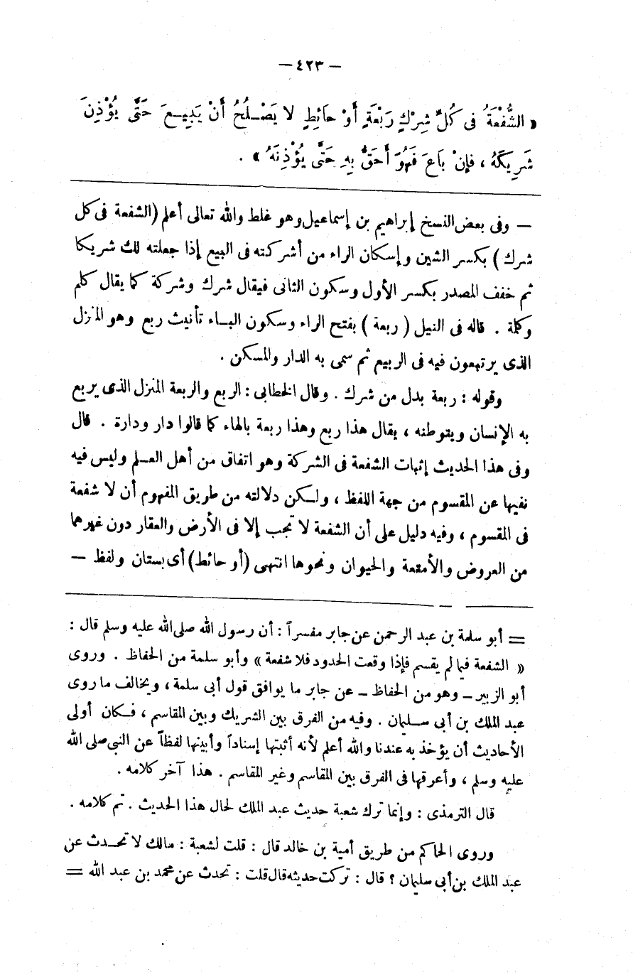 أبو سلمة بن عبد الرحمن عن جابر مفسرا أن رسول الله صلى الله عليه و سلم قال الشفعة فيما لم يقسم فإذا وقعت الحدود فلا شفعة وأبو سلمة من الحفاظ