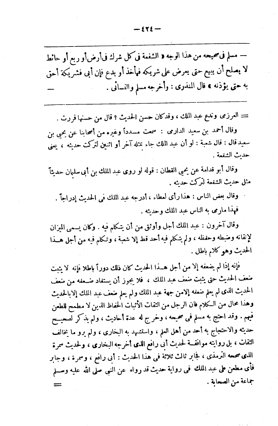 وقال أحمد بن سعيد الدارمي سمعت مسددا وغيره من أصحابنا عن يحيى بن سعيد قال قال شعبة لو أن عبد الملك جاء بمثله آخر أو اثنين لتركت حديثه يعني حديث الشفعة