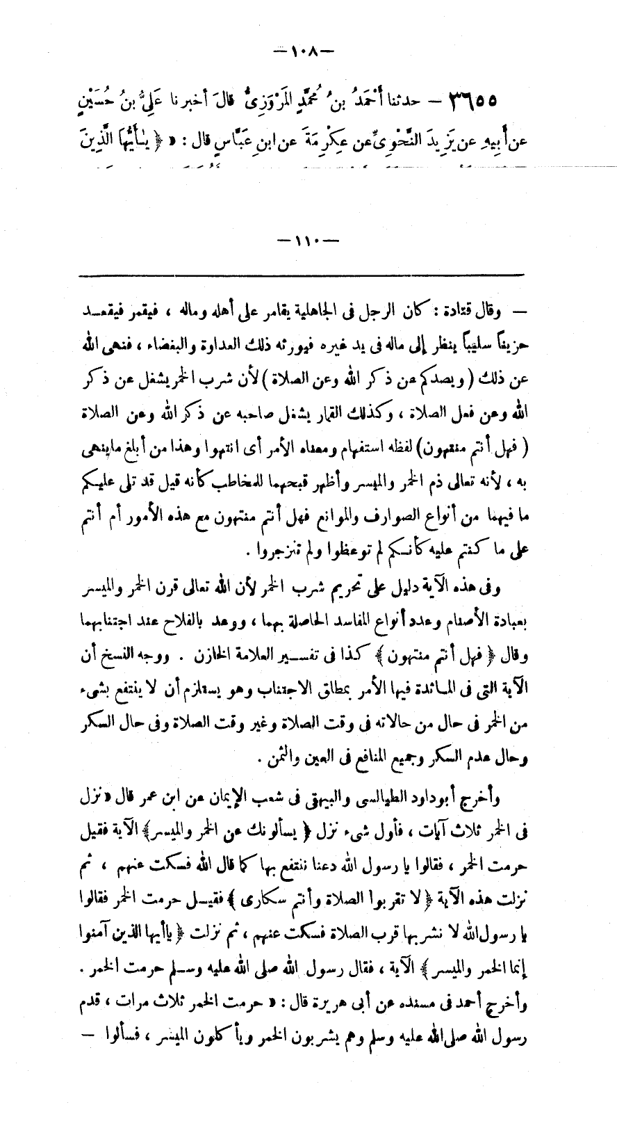 وَأَخْرَجَ اِبْن جَرِير الطَّبَرِيُّ عَنْ اِبْن عَبَّاس أَنَّ رِجَالًا كَانُوا يَأْتُونَ الصَّلَاة وَهُمْ سُكَارَى قَبْل أَنْ تُحَرَّم الْخَمْر فَقَالَ اللَّه عَزَّ وَجَلَّ { يَا أَيُّهَا الَّذِينَ آمَنُوا } الْآيَة { يَسْأَلُونَك عَنْ الْخَمْرِ وَالْمَيْسِرِ قُلْ فِيهِمَا } : أَيْ فِي الْخَمْرِ وَالْمَيْسِرِ { إِثْمٌ كَبِيرٌ } :