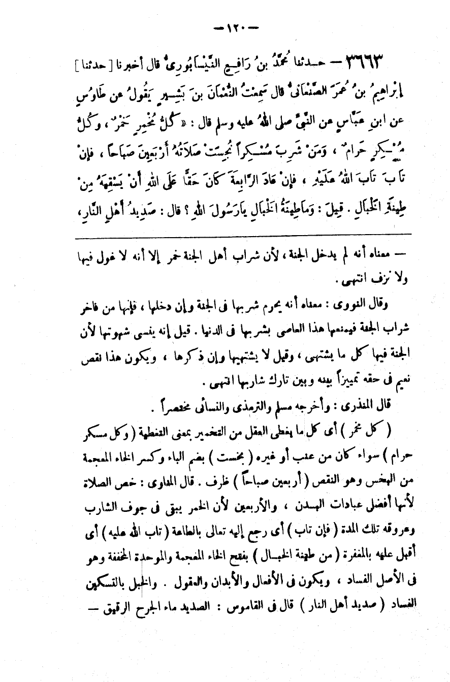 وَقَالَ النَّوَوِيّ : مَعْنَاهُ أَنَّهُ يَحْرُم شُرْبهَا فِي الْجَنَّة وَإِنْ دَخَلَهَا ، فَإِنَّهَا مِنْ فَاخِر شَرَاب الْجَنَّة فَيُمْنَعهَا هَذَا الْعَاصِي بِشُرْبِهَا فِي الدُّنْيَا . قِيلَ إِنَّهُ يَنْسَى شَهْوَتَهَا لِأَنَّ الْجَنَّة فِيهَا كُلّ مَا يَشْتَهِي ، وَقِيلَ لَا يَشْتَهِيهَا وَإِنْ ذَكَرَهَا ، وَيَكُون هَذَا نَقْص نَعِيم فِي حَقّه تَمْيِيزًا بَيْنه وَبَيْن تَارِك شُرْبهَا اِنْتَهَى .