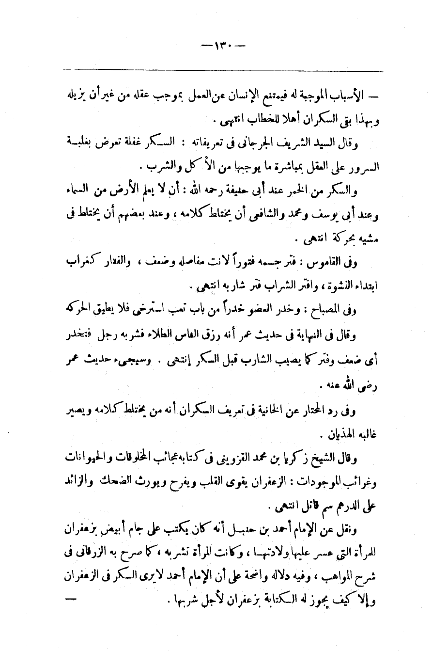 وَنُقِلَ عَنْ الْإِمَام أَحْمَد بْن حَنْبَل أَنَّهُ كَانَ يَكْتُب عَلَى جَام أَبْيَضَ بِزَعْفَرَانٍ لِلْمَرْأَةِ الَّتِي عَسُرَ عَلَيْهَا وِلَادَتهَا ، وَكَانَتْ الْمَرْأَة تَشْرَبهُ ، كَمَا صَرَّحَ بِهِ الزُّرْقَانِيّ فِي شَرْح الْمَوَاهِب ، وَفِيهِ دَلَالَة وَاضِحَة عَلَى أَنَّ الْإِمَام أَحْمَد لَا يَرَى السُّكْر فِي الزَّعْفَرَان وَإِلَّا كَيْف يَجُوز لَهُ الْكِتَابَة بِزَعْفَرَانٍ لِأَجْلِ شُرْبهَا .@