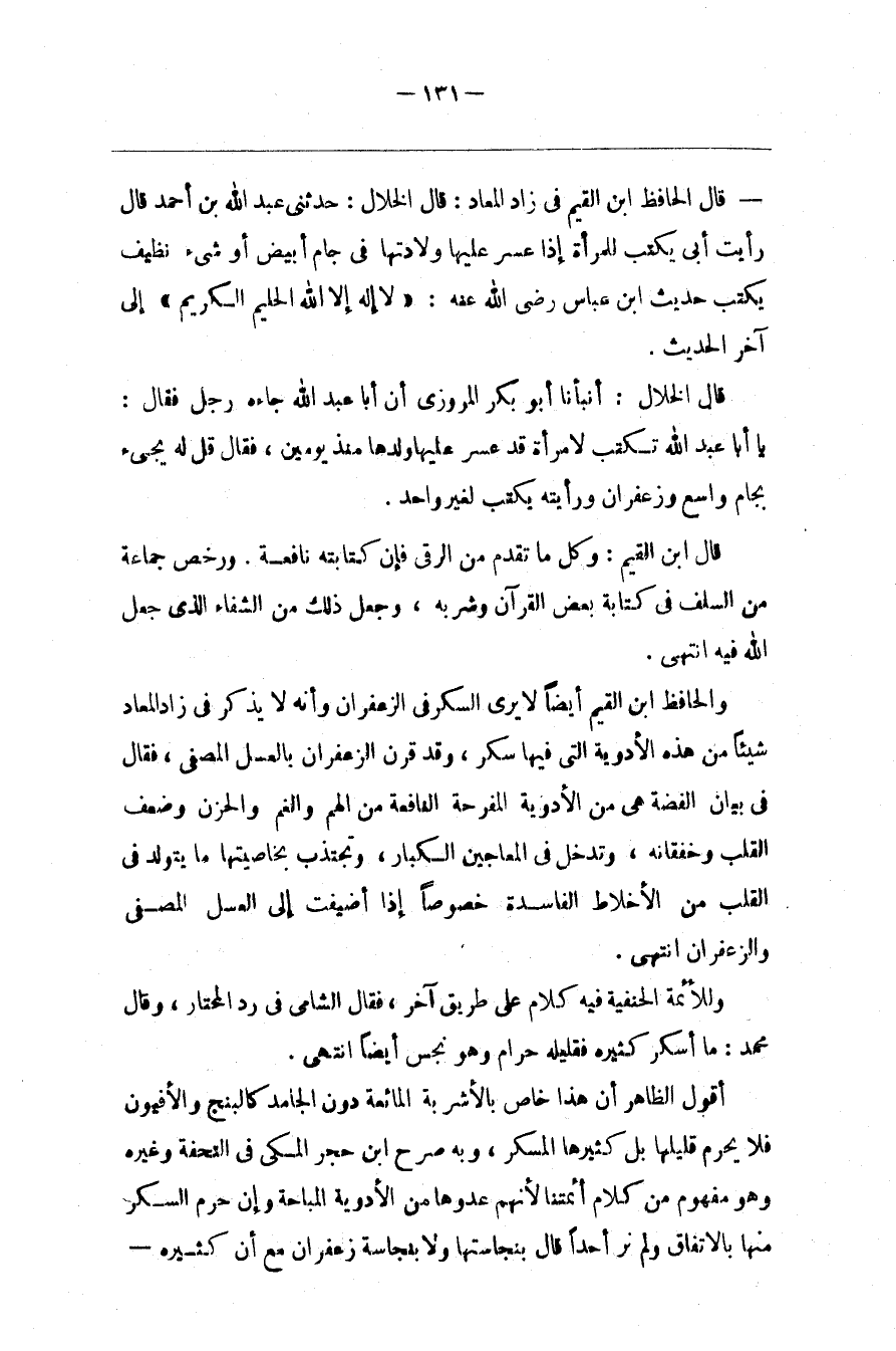 وَالْحَافِظ اِبْن الْقَيِّم أَيْضًا لَا يَرَى السُّكْر فِي الزَّعْفَرَان وَأَنَّهُ لَا يُذْكَر فِي زَاد الْمَعَاد شَيْئًا مِنْ هَذِهِ الْأَدْوِيَة الَّتِي فِيهَا سُكْر ، وَقَدْ قُرِنَ الزَّعْفَرَان بِالْعَسَلِ الْمُصَفَّى ، فَقَالَ فِي بَيَان الْفِضَّة هِيَ مِنْ الْأَدْوِيَة الْمُفْرِحَة النَّافِعَة مِنْ الْهَمّ وَالْغَمّ وَالْحَزَن وَضَعْف الْقَلْب وَخَفَقَانه ، وَتَدْخُل فِي الْمَعَاجِين الْكِبَار ، وَتَجْتَذِب بِخَاصِّيَّتِهَا مَا يَتَوَلَّد فِي الْقَلْب مِنْ الْأَخْلَاط الْفَاسِدَة خُصُوصًا إِذَا أُضِيفَتْ إِلَى الْعَسَل الْمُصَفَّى وَالزَّعْفَرَان اِنْتَهَى .
