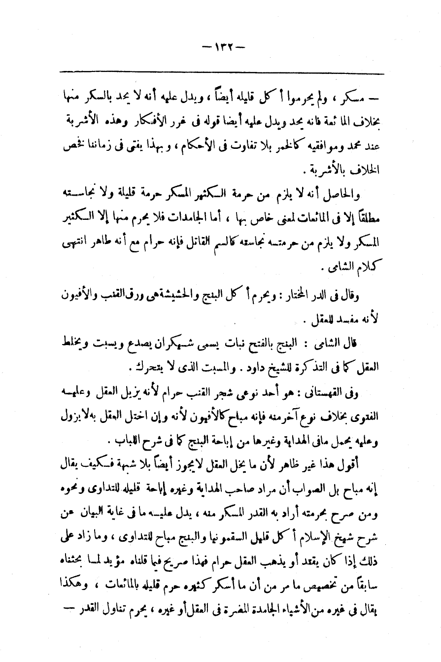 أَقُول هَذَا غَيْر ظَاهِر لِأَنَّ مَا يُخِلّ الْعَقْلَ لَا يَجُوز أَيْضًا بِلَا شُبْهَةٍ فَكَيْف يُقَال إِنَّهُ مُبَاح بَلْ الصَّوَاب أَنَّ مُرَاد صَاحِب الْهِدَايَة وَغَيْره إِبَاحَة قَلِيله لِلتَّدَاوِي وَنَحْوه وَمَنْ صَرَّحَ بِحُرْمَتِهِ أَرَادَ بِهِ الْقَدْر الْمُسْكِر مِنْهُ ، يَدُلّ عَلَيْهِ مَا فِي غَايَة الْبَيَان عَنْ شَرْح شَيْخ الْإِسْلَام أَكْل قَلِيل السَّقَمُونِيَا وَالْبَنْج مُبَاح لِلتَّدَاوِي ، وَمَا زَادَ عَلَى ذَلِكَ إِذَا كَانَ يُفَتِّر أَوْ يُذْهِب الْعَقْلَ حَرَام فَهَذَا صَرِيح فِيمَا قُلْنَاهُ مُؤَيِّد لِمَا بَحَثْنَاهُ سَابِقًا مِنْ تَخْصِيص مَا مَرَّ مِنْ أَنَّ مَا أَسْكَرَ كَثِيره حُرِّمَ قَلِيله بِالْمَائِعَاتِ ، وَهَكَذَا يُقَال فِي غَيْره مِنْ الْأَشْيَاء الْجَامِدَة الْمُضِرَّة فِي الْعَقْل أَوْ غَيْره ، يَحْرُم تَنَاوُل الْقَدْر@