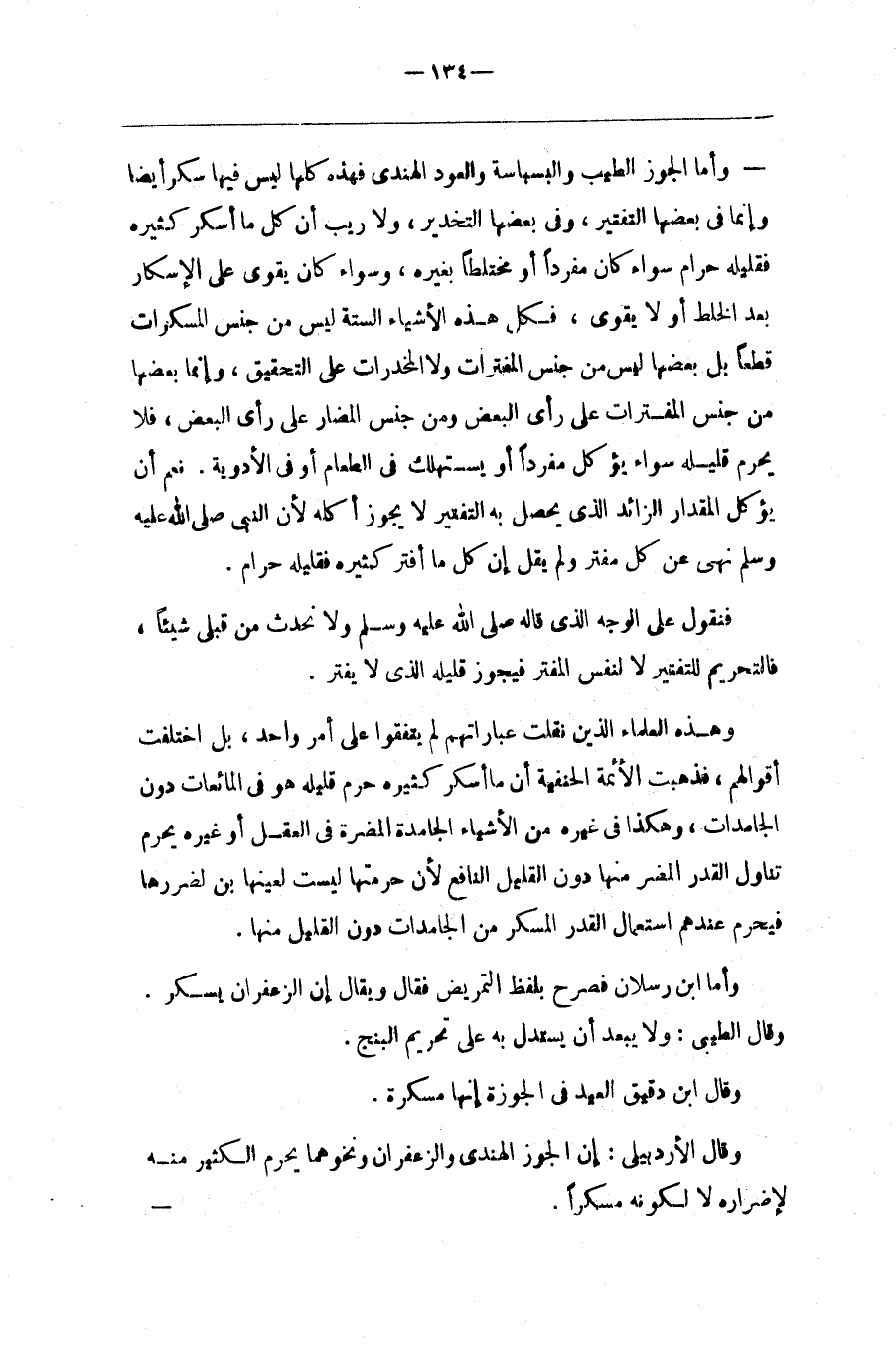 وَأَمَّا الْجَوْز الطِّيب وَالْبَسْبَاسَة وَالْعُود الْهِنْدِيّ فَهَذِهِ كُلّهَا لَيْسَ فِيهَا سُكْر أَيْضًا وَإِنَّمَا فِي بَعْضهَا التَّفْتِير ، وَفِي بَعْضهَا التَّخْدِير ، وَلَا رَيْب أَنَّ كُلّ مَا أَسْكَرَ كَثِيره فَقَلِيله حَرَام سَوَاء كَانَ مُفْرَدًا أَوْ مُخْتَلِطًا بِغَيْرِهِ ، وَسَوَاء كَانَ يَقْوَى عَلَى الْإِسْكَار بَعْد الْخَلْط أَوْ لَا يَقْوَى ، فَكُلّ هَذِهِ الْأَشْيَاء السِّتَّة لَيْسَ مِنْ جِنْس الْمُسْكِرَات قَطْعًا بَلْ بَعْضهَا لَيْسَ مِنْ جِنْس الْمُفَتِّرَات وَلَا الْمُخَدِّرَات عَلَى التَّحْقِيق ، وَإِنَّمَا بَعْضهَا مِنْ جِنْس الْمُفَتِّرَات عَلَى رَأْي الْبَعْض وَمِنْ جِنْس الْمَضَارّ عَلَى رَأَى الْبَعْض ، فَلَا يَحْرُم قَلِيله سَوَاء يُؤْكَل مُفْرَدًا أَوْ يُسْتَهْلَك فِي الطَّعَام أَوْ فِي الْأَدْوِيَة . نَعَمْ أَنْ يُؤْكَل الْمِقْدَار الزَّائِد الَّذِي يَحْصُل بِهِ التَّفْتِير لَا يَجُوز أَكْله لِأَنَّ النَّبِيّ صَلَّى اللَّه عَلَيْهِ وَسَلَّمَ نَهَى عَنْ كُلّ مُفَتِّر وَلَمْ يَقُلْ إِنَّ كُلّ مَا أَفَتَرَ كَثِيره فَقَلِيله حَرَام . فَنَقُول عَلَى الْوَجْه الَّذِي قَالَهُ صَلَّى اللَّه عَلَيْهِ وَسَلَّمَ وَلَا نُحَدِّث مِنْ قِبَلِي شَيْئًا ، فَالتَّحْرِيم لِلتَّفْتِيرِ لَا لِنَفْسِ الْمُفَتِّر فَيَجُوز قَلِيله الَّذِي لَا يُفَتِّر .