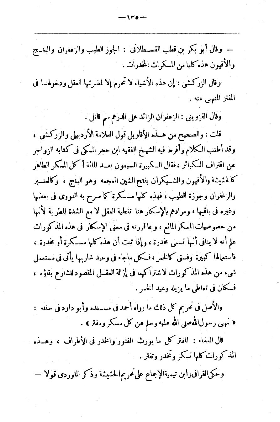 قُلْت : وَالصَّحِيح مِنْ هَذِهِ الْأَقَاوِيل قَوْل الْعَلَّامَة الْأَرْدَبِيلِيّ وَالزَّرْكَشِيّ ، وَقَدْ أَطْنَبَ الْكَلَام وَأَفْرَطَ فِيهِ الشَّيْخ الْفَقِيه اِبْن حَجَر الْمَكِّيّ فِي كِتَابه الزَّوَاجِر عَنْ اِقْتِرَاف الْكَبَائِر ، فَقَالَ الْكَبِيرَة السَّبْعُونَ بَعْد الْمِائَة أَكْل الْمُسْكِر الطَّاهِر كَالْحَشِيشَةِ وَالْأَفْيُون وَالشَّيْكَرَان بِفَتْحِ الشِّين الْمُعْجَمَة وَهُوَ الْبَنْج ، وَكَالْعَنْبَرِ وَالزَّعْفَرَان وَجَوْزَة الطِّيب ، فَهَذِهِ كُلّهَا مُسْكِرَة كَمَا صَرَّحَ بِهِ النَّوَوِيّ فِي بَعْضهَا وَغَيْره فِي بَاقِيهَا ، وَمُرَادهمْ بِالْإِسْكَارِ هُنَا تَغْطِيَة الْعَقْل لَا مَعَ الشِّدَّة الْمُطْرِبَة لِأَنَّهَا مِنْ خُصُوصِيَّات الْمُسْكِر الْمَائِع ، وَبِمَا قَرَّرْته فِي مَعْنَى الْإِسْكَار فِي هَذِهِ الْمَذْكُورَات عُلِمَ أَنَّهُ لَا يُنَافِي أَنَّهَا تُسَمَّى مُخَدِّرَة ، وَإِذَا ثَبَتَ أَنَّ هَذِهِ كُلّهَا مُسْكِرَة أَوْ مُخَدِّرَة ، فَاسْتِعْمَالهَا كَبِيرَة وَفِسْق كَالْخَمْرِ ، فَكُلّ مَا جَاءَ فِي وَعِيد شَارِبهَا يَأْتِي فِي مُسْتَعْمِل شَيْء مِنْ هَذِهِ الْمَذْكُورَات لِاشْتِرَاكِهِمَا فِي إِزَالَة الْعَقْل الْمَقْصُود لِلشَّارِعِ بَقَاؤُهُ ، فَكَانَ فِي تَعَاطِي مَا يُزِيلهُ وَعِيد الْخَمْر .