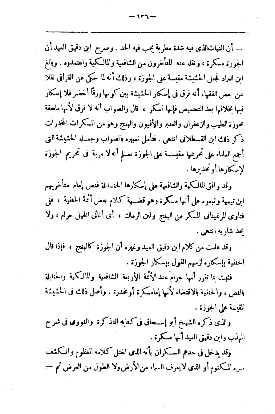 أَنَّ النَّبَات الَّذِي فِيهِ شِدَّة مُطْرِبَة يَجِب فِيهِ الْحَدّ . وَصَرَّحَ اِبْن دَقِيق الْعِيد أَنَّ الْجَوْزَة مُسْكِرَة ، وَنَقَلَهُ عَنْهُ الْمُتَأَخِّرُونَ مِنْ الشَّافِعِيَّة وَالْمَالِكِيَّة وَاعْتَمَدُوهُ . وَبَالَغَ اِبْن الْعِمَاد فَجَعَلَ الْحَشِيشَة مَقِيسَة عَلَى الْجَوْزَة ، وَذَلِكَ أَنَّهُ لَمَّا حُكِيَ عَنْ الْقَرَافِيّ نَقْلًا عَنْ بَعْض الْفُقَهَاء أَنَّهُ فَرَّقَ فِي إِسْكَار الْحَشِيشَة بَيْن كَوْنهَا وَرَقًا أَخْضَرَ فَلَا إِسْكَار فِيهَا بِخِلَافِهَا بَعْد التَّحْمِيص فَإِنَّهَا تُسْكِر ، قَالَ وَالصَّوَاب أَنَّهُ لَا فَرْق لِأَنَّهَا مُلْحَقَة بِجَوْزَةِ الطِّيب وَالزَّعْفَرَان وَالْعَنْبَر وَالْأَفْيُون وَالْبَنْج وَهُوَ مِنْ الْمُسْكِرَات الْمُخَدِّرَات ذَكَرَ ذَلِكَ اِبْن الْقَسْطَلَّانِيّ اِنْتَهَى . فَتَأَمَّلْ تَعْبِيره بِالصَّوَابِ وَجَعْله الْحَشِيشَة الَّتِي أَجْمَع الْعُلَمَاء عَلَى تَحْرِيمهَا مَقِيسَة عَلَى الْجَوْزَة تَعْلَم أَنَّهُ لَا مِرْيَة فِي تَحْرِيم الْجَوْزَة لِإِسْكَارِهَا أَوْ تَخْدِيرهَا .