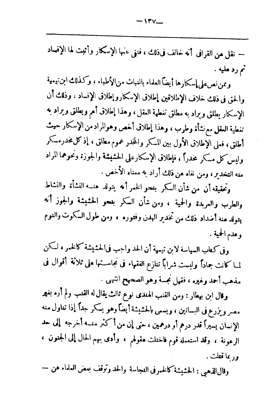 وَمِمَّنْ نَصَّ عَلَى إِسْكَارهَا أَيْضًا الْعُلَمَاء بِالنَّبَاتِ مِنْ الْأَطِبَّاء ، وَكَذَلِكَ اِبْن تَيْمِيَّة وَالْحَقّ فِي ذَلِكَ خِلَاف الْإِطْلَاقَيْنِ إِطْلَاق الْإِسْكَار وَإِطْلَاق الْإِفْسَاد ، وَذَلِكَ أَنَّ الْإِسْكَار يُطْلَق وَيُرَاد بِهِ مُطْلَق تَغْطِيَة الْعَقْل ، وَهَذَا إِطْلَاق أَعَمُّ وَيُطْلَق وَيُرَاد بِهِ تَغْطِيَة الْعَقْل مَعَ نَشْوَة وَطَرَب ، وَهَذَا إِطْلَاق أَخَصّ وَهُوَ الْمُرَاد مِنْ الْإِسْكَار حَيْثُ أُطْلِقَ ، فَعَلَى الْإِطْلَاق الْأَوَّل بَيْن الْمُسْكِر وَالْمُخَدِّر عُمُوم مُطْلَق ، إِذْ كُلّ مُخَدِّر مُسْكِر وَلَيْسَ كُلّ مُسْكِر مُخَدِّرًا ، فَإِطْلَاق الْإِسْكَار عَلَى الْحَشِيشَة وَالْجَوْزَة وَنَحْوهمَا الْمُرَاد مِنْهُ التَّخْدِير ، وَمَنْ نَفَاهُ عَنْ ذَلِكَ أَرَادَ بِهِ مَعْنَاهُ الْأَخَصّ . وَتَحْقِيقه أَنَّ مِنْ شَأْن السُّكْر بِنَحْوِ الْخَمْر أَنَّهُ يَتَوَلَّد عَنْهُ النَّشْوَة وَالنَّشَاط وَالطَّرَب وَالْعَرْبَدَة وَالْحَمِيَّة ، وَمِنْ شَأْن السُّكْر بِنَحْوِ الْحَشِيشَة وَالْجَوْز أَنَّهُ يَتَوَلَّد عَنْهُ أَضْدَاد ذَلِكَ مِنْ تَخْدِير الْبَدَن وَفُتُوره ، وَمِنْ طُول السُّكُوت وَالنَّوْم وَعَدَم الْحِمْيَة . وَفِي كِتَاب السِّيَاسَة لِابْنِ تَيْمِيَّة أَنَّ الْحَدّ وَاجِب فِي الْحَشِيشَة كَالْخَمْرِ ، لَكِنْ لَمَّا كَانَتْ جَمَادًا وَلَيْسَتْ شَرَابًا تَنَازَعَ الْفُقَهَاء فِي نَجَاسَتهَا عَلَى ثَلَاثَة أَقْوَال فِي مَذْهَب أَحْمَد وَغَيْره ، فَقِيلَ نَجِسَة وَهُوَ الصَّحِيح اِنْتَهَى .