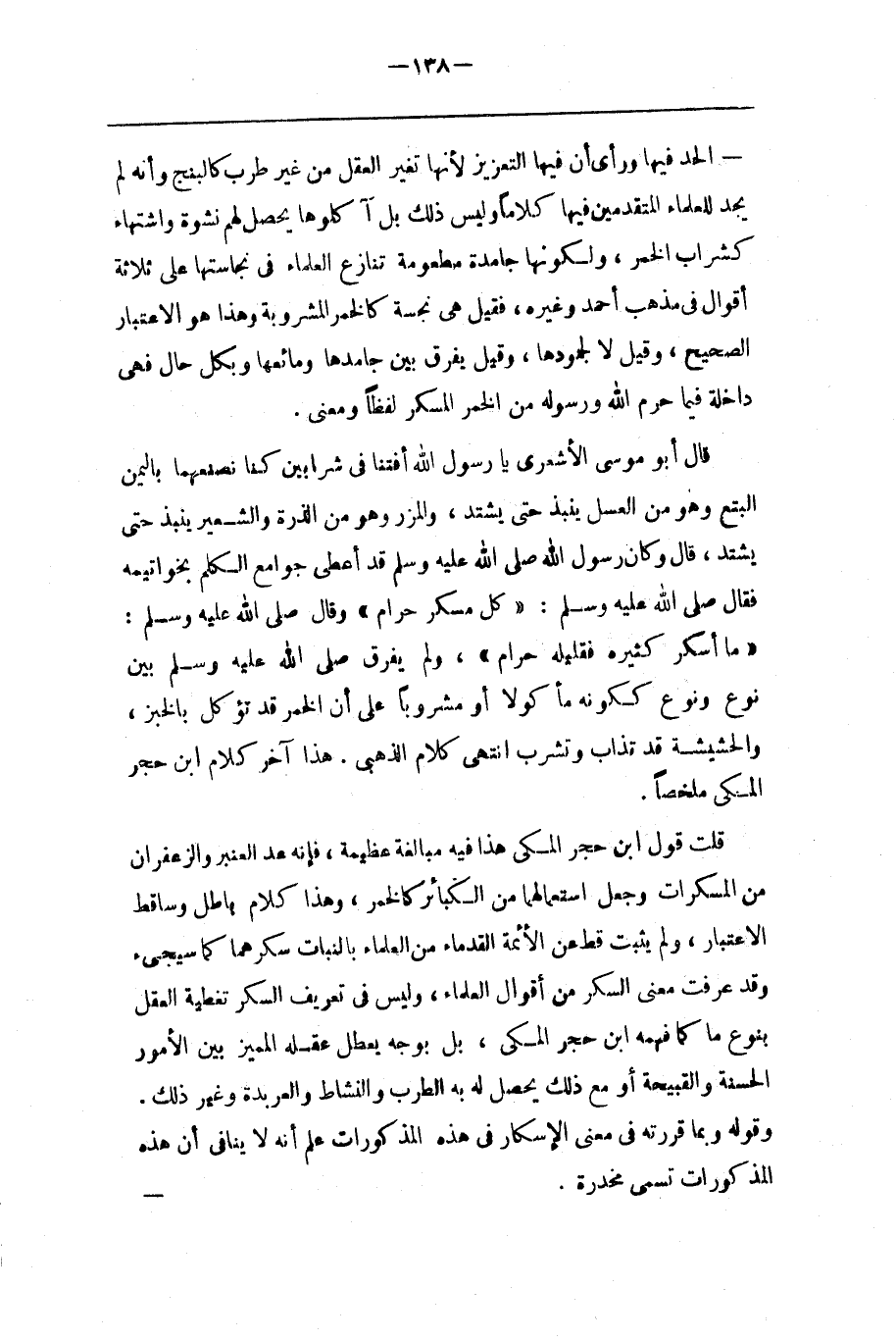 الْحَدّ فِيهَا وَرَأَى فِيهَا التَّعْزِير لِأَنَّهَا تُغَيِّر الْعَقْل مِنْ غَيْر طَرَب كَالْبَنْجِ وَأَنَّهُ لَمْ يَجِد لِلْعُلَمَاءِ الْمُتَقَدِّمِينَ فِيهَا كَلَامًا وَلَيْسَ ذَلِكَ بَلْ آكِلُوهَا يَحْصُل لَهُمْ نَشْوَة وَاشْتِهَاء كَشَرَابِ الْخَمْر ، وَلِكَوْنِهَا جَامِدَة مَطْعُومَة تَنَازَعَ الْعُلَمَاء فِي نَجَاسَتهَا عَلَى ثَلَاثَة أَقْوَال فِي مَذْهَب أَحْمَد وَغَيْره ، فَقِيلَ هِيَ نَجِسَة كَالْخَمْرِ الْمَشْرُوبَة وَهَذَا هُوَ الِاعْتِبَار الصَّحِيح ، وَقِيلَ لَا لِجُمُودِهَا ، وَقِيلَ يُفَرَّق بَيْن جَامِدهَا وَمَائِعهَا وَبِكُلِّ حَال فَهِيَ دَاخِلَة فِيمَا حَرَّمَ اللَّه وَرَسُوله مِنْ الْخَمْر الْمُسْكِر لَفْظًا وَمَعْنًى . قَالَ أَبُو مُوسَى الْأَشْعَرِيّ يَا رَسُول اللَّه أَفْتِنَا فِي شَرَابَيْنِ كُنَّا نَصْنَعهُمَا بِالْيَمَنِ الْبِتْع وَهُوَ مِنْ الْعَسَل يُنْبَذ حَتَّى يَشْتَدّ ، وَالْمِزْر وَهُوَ مِنْ الذُّرَة وَالشَّعِير يُنْبَذ حَتَّى يَشْتَدّ ، قَالَ وَكَانَ رَسُول اللَّه صَلَّى اللَّه عَلَيْهِ وَسَلَّمَ قَدْ أُعْطِيَ جَوَامِع الْكَلِم بِخَوَاتِيمِهِ فَقَالَ صَلَّى اللَّه عَلَيْهِ وَسَلَّمَ : " كُلّ مُسْكِر حَرَام " وَقَالَ صَلَّى اللَّه عَلَيْهِ وَسَلَّمَ : " مَا أَسْكَرَ كَثِيره فَقَلِيله حَرَام " ، وَلَمْ يُفَرِّق صَلَّى اللَّه عَلَيْهِ وَسَلَّمَ بَيْن نَوْع وَنَوْع كَكَوْنِهِ مَأْكُولًا أَوْ مَشْرُوبًا عَلَى أَنَّ الْخَمْر قَدْ تُؤْكَل بِالْخُبْزِ ، وَالْحَشِيشَة قَدْ تُذَاب وَتُشْرَب اِنْتَهَى كَلَام الذَّهَبِيّ . هَذَا آخِر كَلَام اِبْن حَجَر الْمَكِّيّ مُلَخَّصًا .